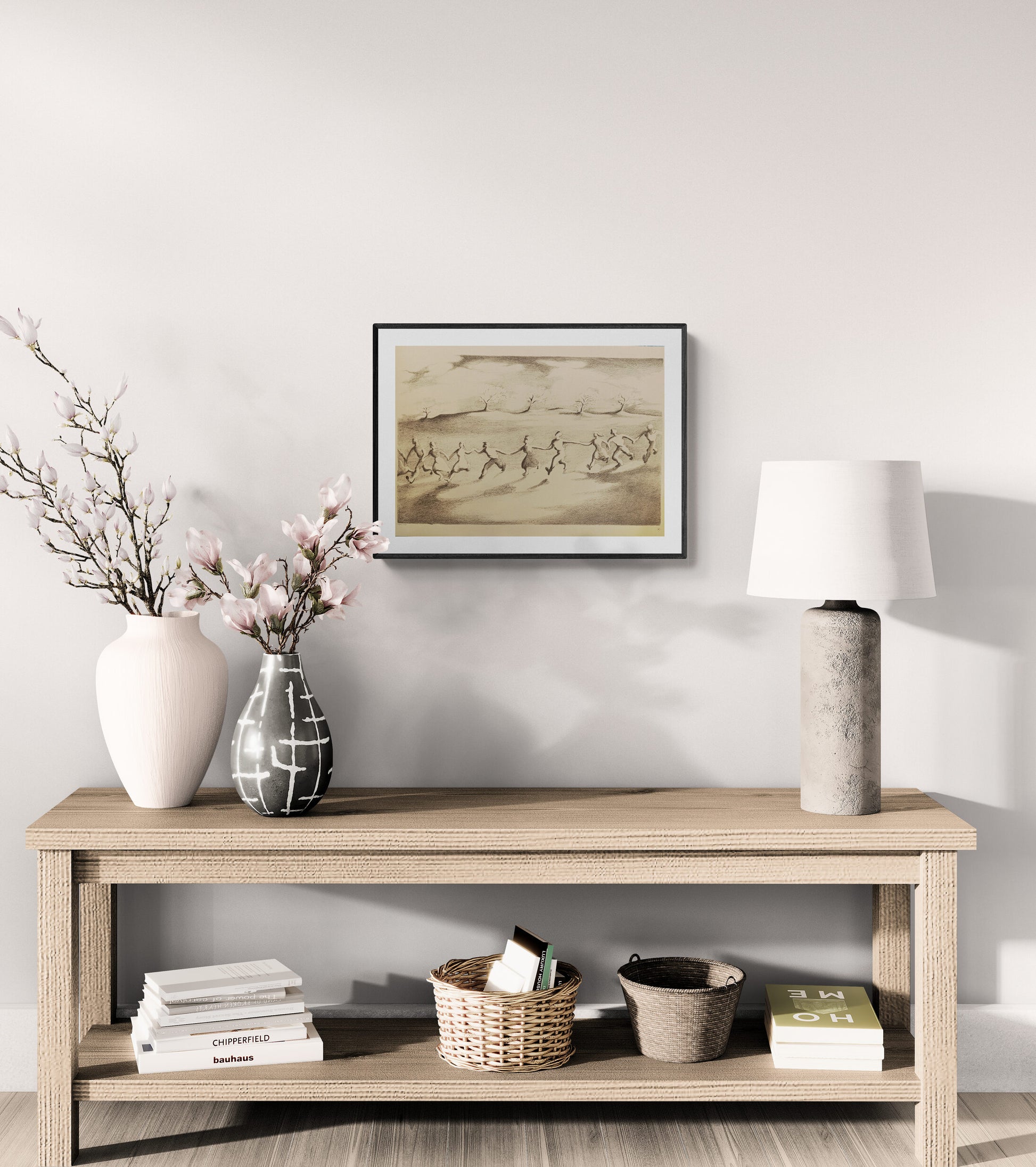 The figures, sketched with flowing, dynamic lines, seem to float across a barren landscape under a vast sky. The simplicity of the setting allows the focus to rest on the dancers, whose movements symbolize togetherness, freedom, and celebration of life. The use of light and shadow gives the figures depth, and their interlinked hands highlight the importance of connection and unity. The rhythmic energy in the piece evokes a sense of harmony with nature and with each other.