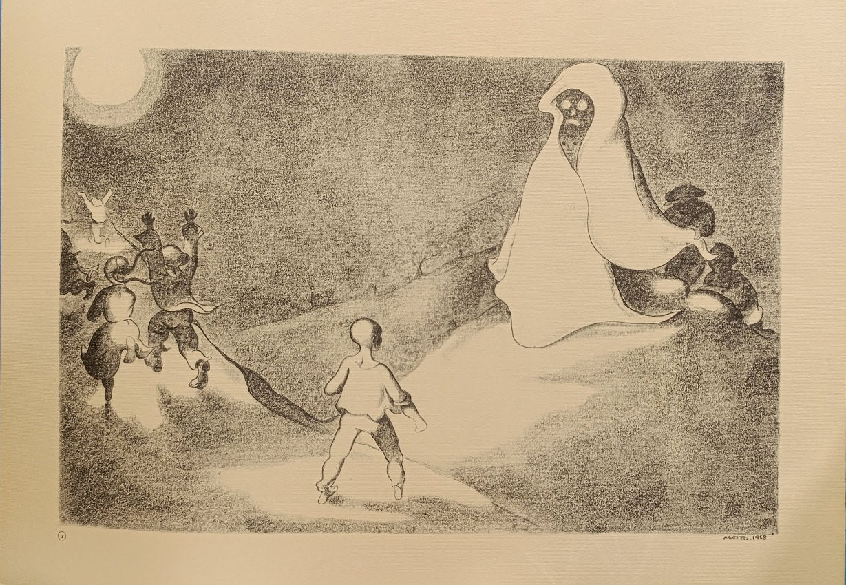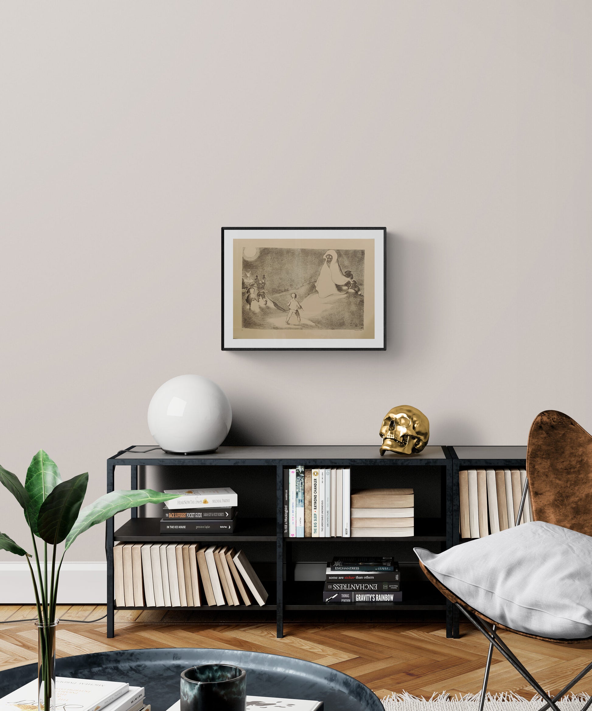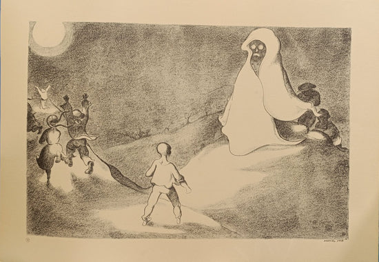 The central figure, stands between these two contrasting worlds, observing the spectral presence. The atmosphere is surreal, with the ghost’s draped cloak creating an unsettling yet calm demeanor. The dark tones and soft shading of the landscape enhance the mystical and dreamlike quality of the piece, suggesting an encounter between the world of the living and the supernatural.