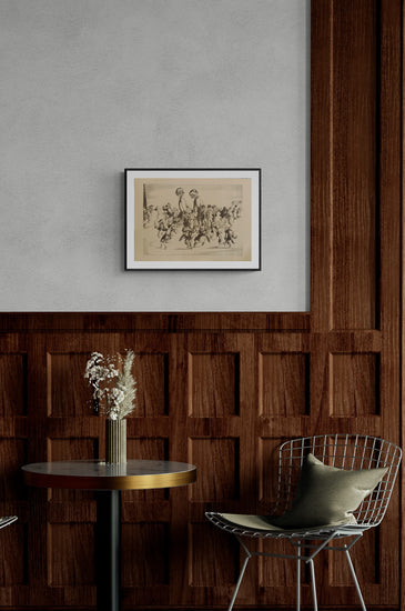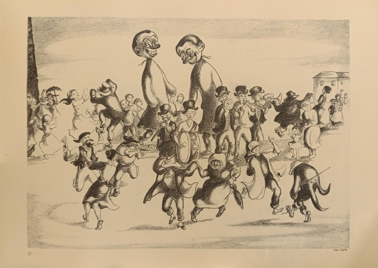 The composition is filled with lively figures dancing, playing instruments, and wearing festive costumes, led by two giant, exaggerated puppets towering above the crowd. These oversized puppets add a whimsical and surreal element to the scene. The band playing in the background heightens the joyful atmosphere, as people of all ages join the festivities with exuberant movements. The use of detailed line work brings each character to life, giving the piece a sense of movement and rhythm, reminiscent of traditional street parades.