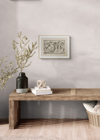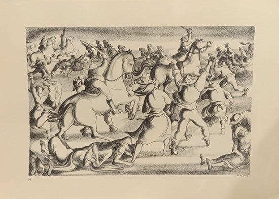 The artwork presents riders on horseback, charging and clashing amidst a whirl of movement. The figures are both aggressive and desperate, with a dynamic energy portrayed in the raised weapons and galloping horses. Some soldiers have fallen, emphasizing the brutal reality of combat. The composition is filled with tension, with each character actively engaged in the struggle. The stylized figures and sweeping lines convey a sense of urgency and conflict, underscoring the themes of power, resistance, and survival.