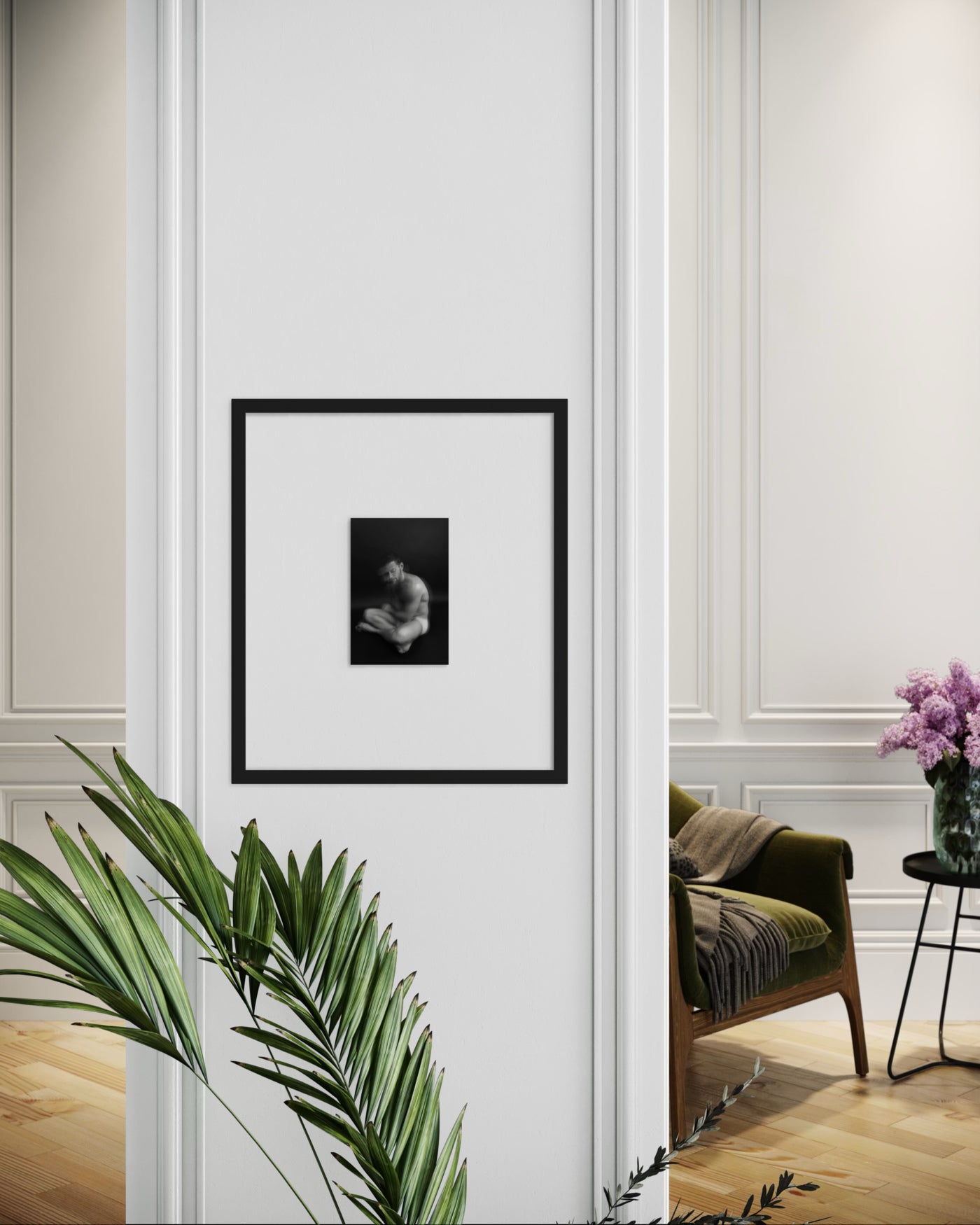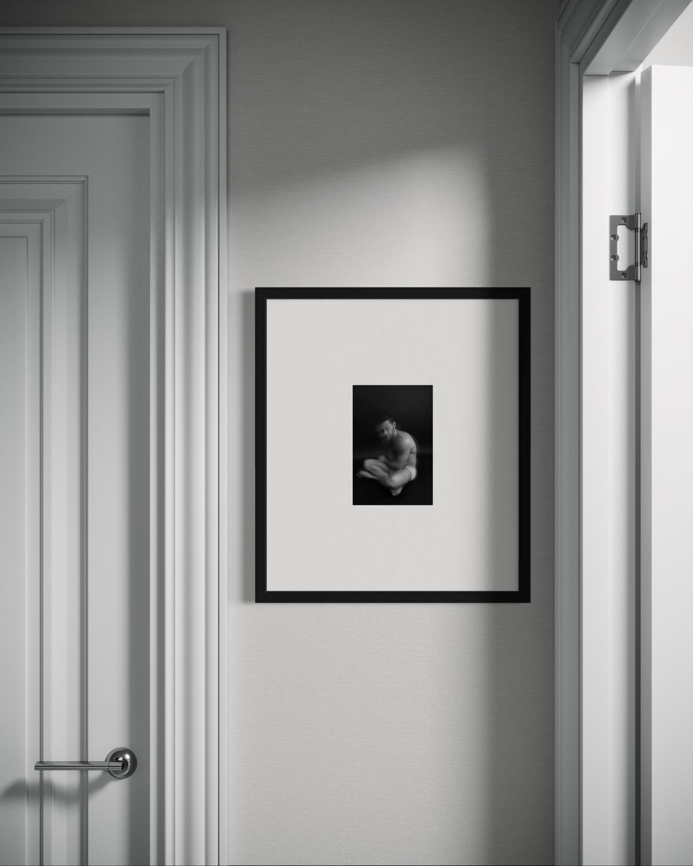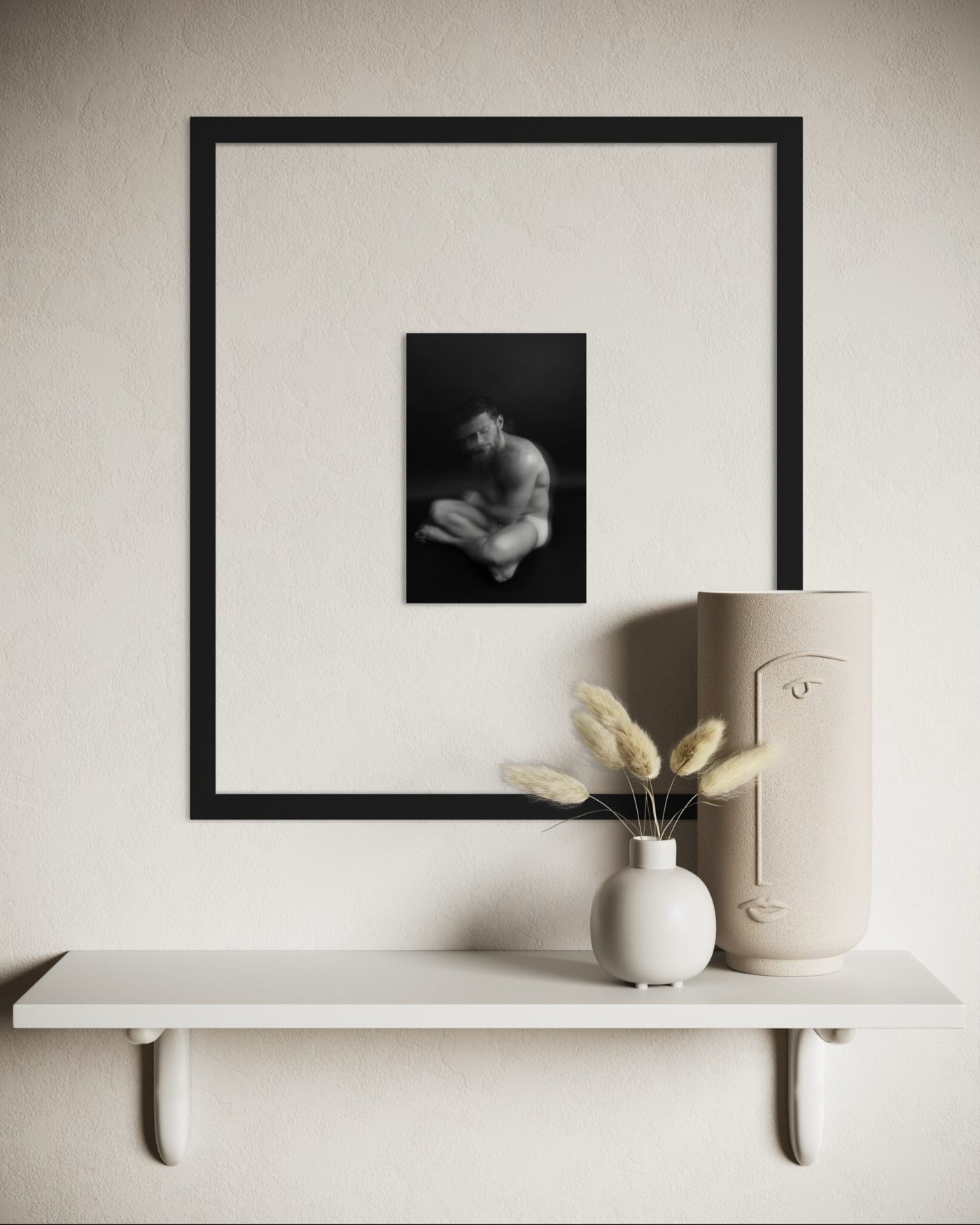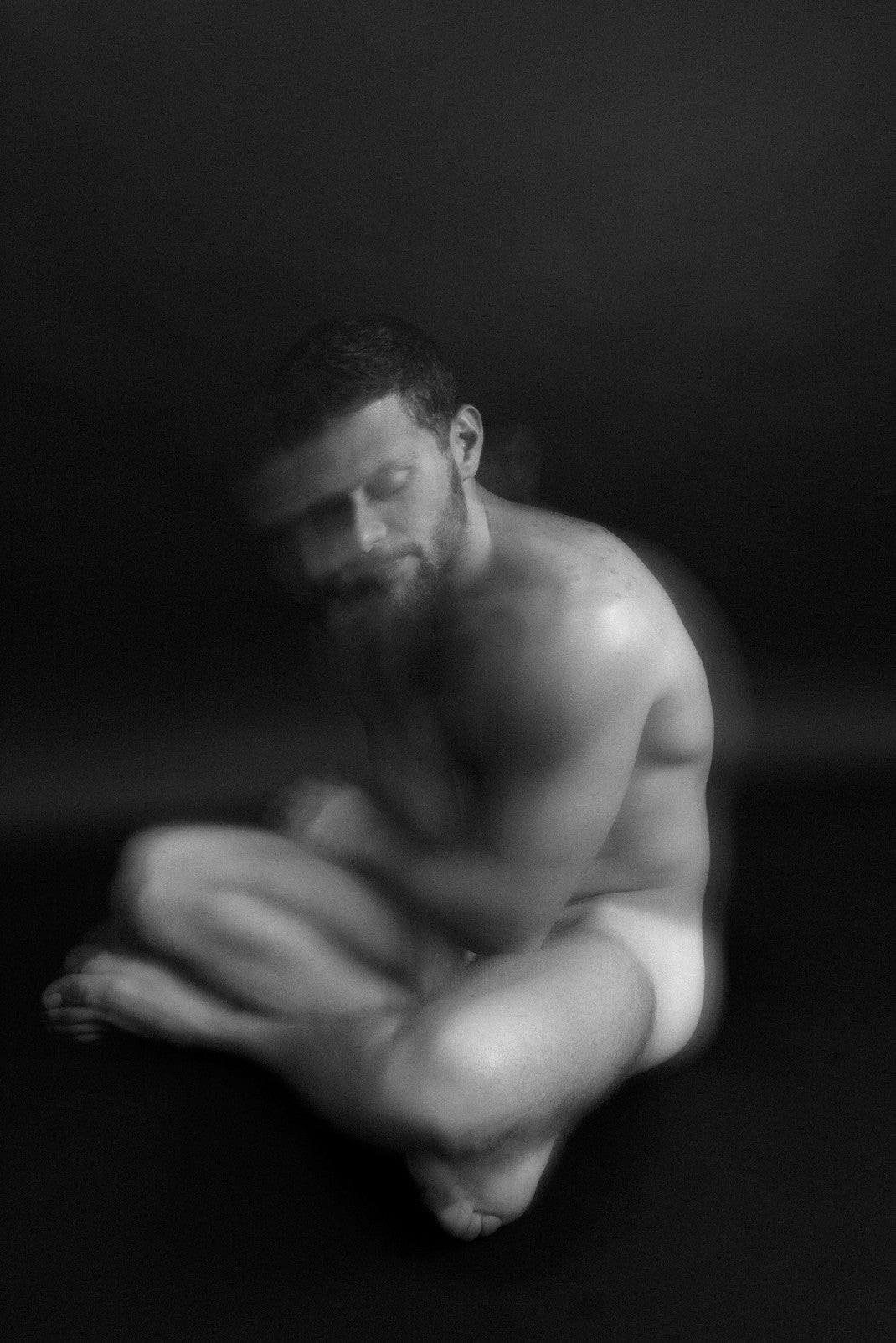 In this black-and-white photograph by Duda Breda, a nude male figure sits on the floor with his knees drawn inward. The artist employs gentle motion blur around the subject’s upper body, subtly obscuring the face while emphasizing the fleeting nature of self-perception. The figure’s quiet posture contrasts with the soft, diffuse lighting, creating a dreamlike atmosphere that suggests introspection and vulnerability.