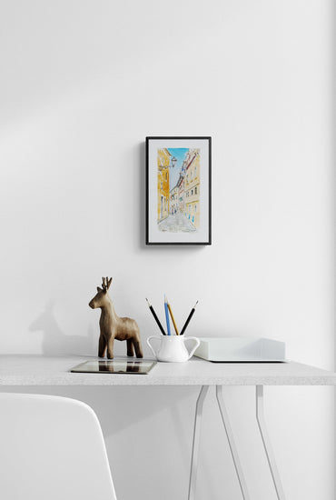 The artist's adept use of perspective draws the viewer's eye through the meandering path, as figures walk towards a distant vanishing point. The traditional lantern hanging from the wall adds a quaint touch, enhancing the European vibe of this picturesque scene. The painting's luminous and transparent watercolor technique enhances its airy and light atmosphere, making it an evocative piece for any lover of urban landscapes.