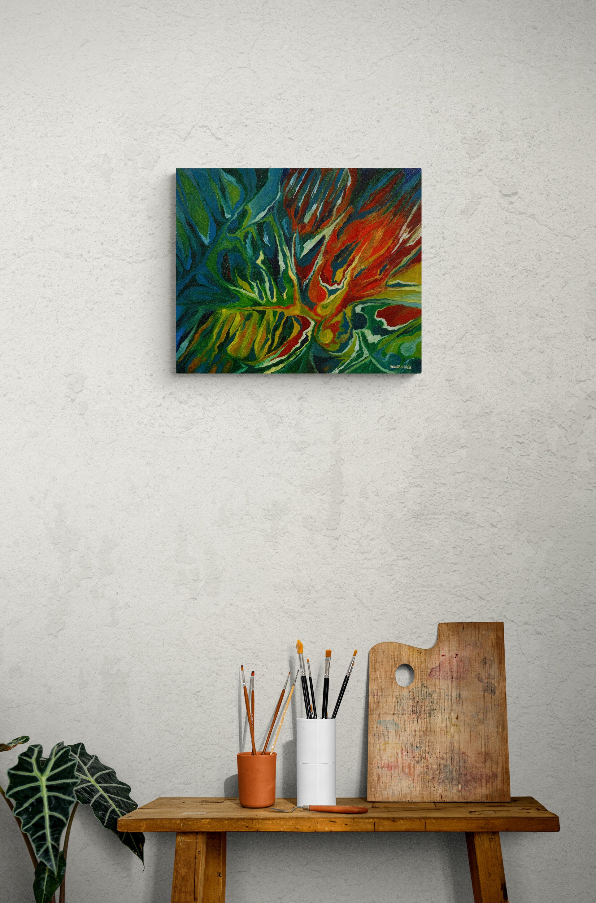 This abstract painting bursts with energy, capturing the essence of nature's vibrant heartbeat. The rich interplay of greens, reds, and blues swirl together, creating a dynamic and organic composition that evokes the rhythmic flow of life and growth within the natural world.