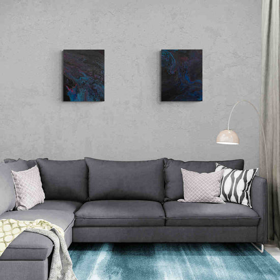 Similar to its counterpart, this painting delves deeper into the mysteries of space with swirling nebular motifs in shades of blue, purple, and pink. The technique used creates a sense of depth and motion, as if one is staring into the far reaches of the universe.