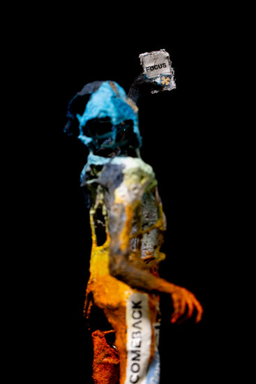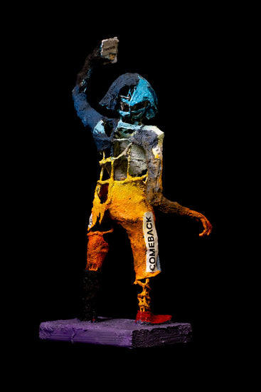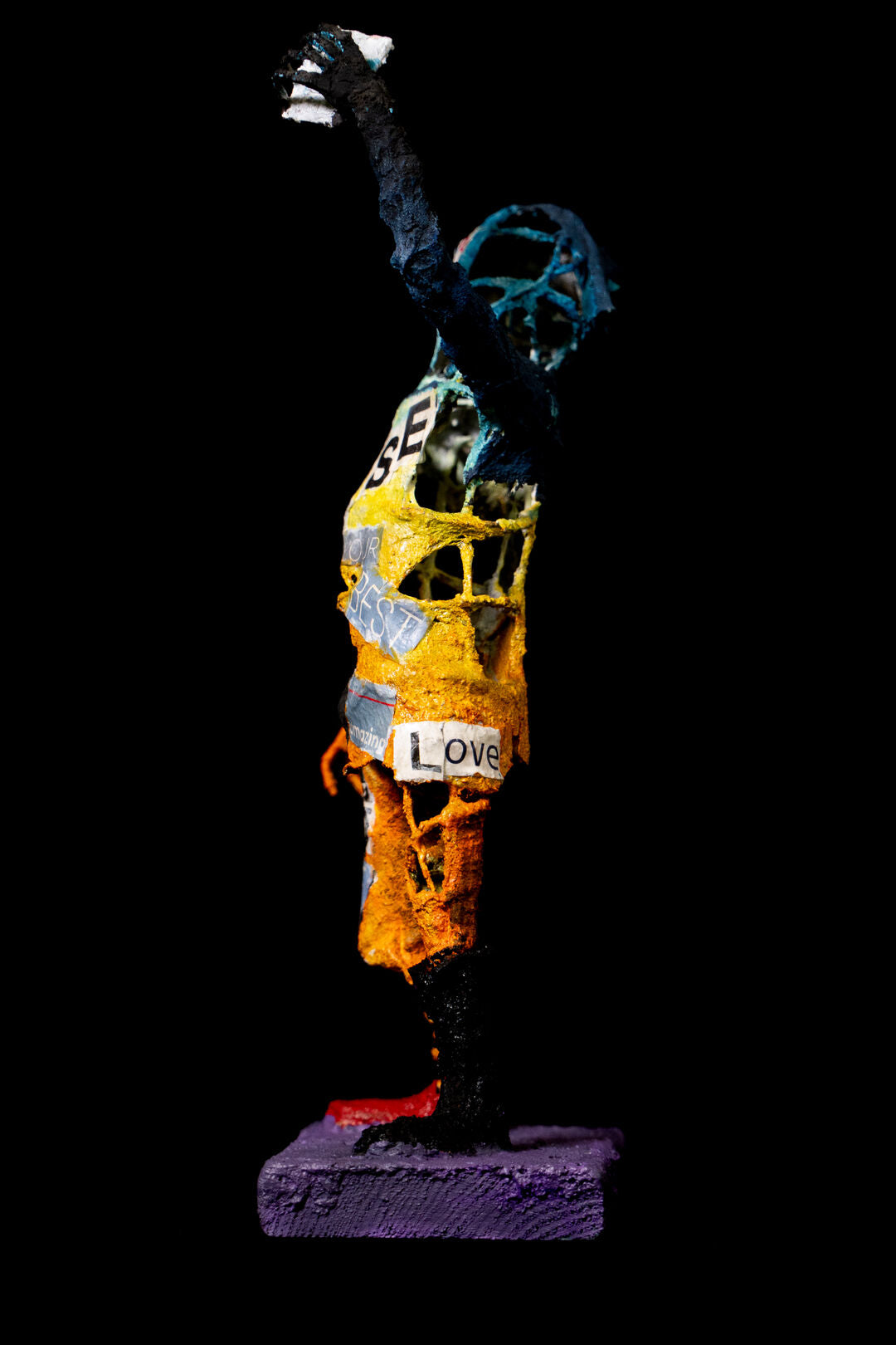 A thought-provoking sculpture that embodies the spirit of self-empowerment and positivity. The figure, painted in dynamic hues of blue, orange, and yellow, is adorned with inspiring words like “LOVE,” “RISE,” “BE YOUR BEST,” and “GIVE.” These uplifting messages, collaged onto the sculpture, transform it into a symbol of resilience and growth. The figure’s pose, with one arm reaching upward, suggests aspiration and hope, while the fragmented, textured surface reflects the journey of self-discovery and transformation. Set against a stark black background, the colors and messages stand out boldly, inviting viewers to connect with themes of motivation, self-worth, and the power of positivity.