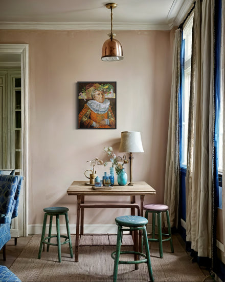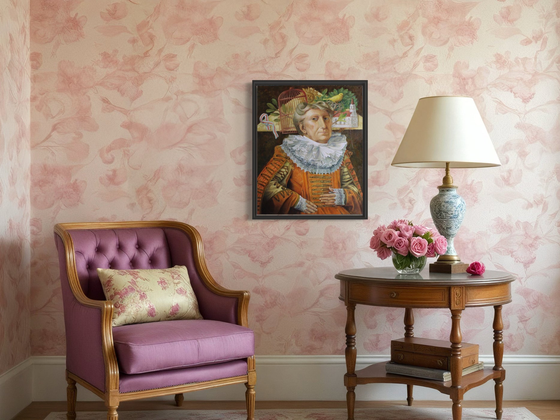 A richly hued, Renaissance-inspired portrait of a noble figure in ornate attire, juxtaposed with a birdcage and a bright canary perched outside.
