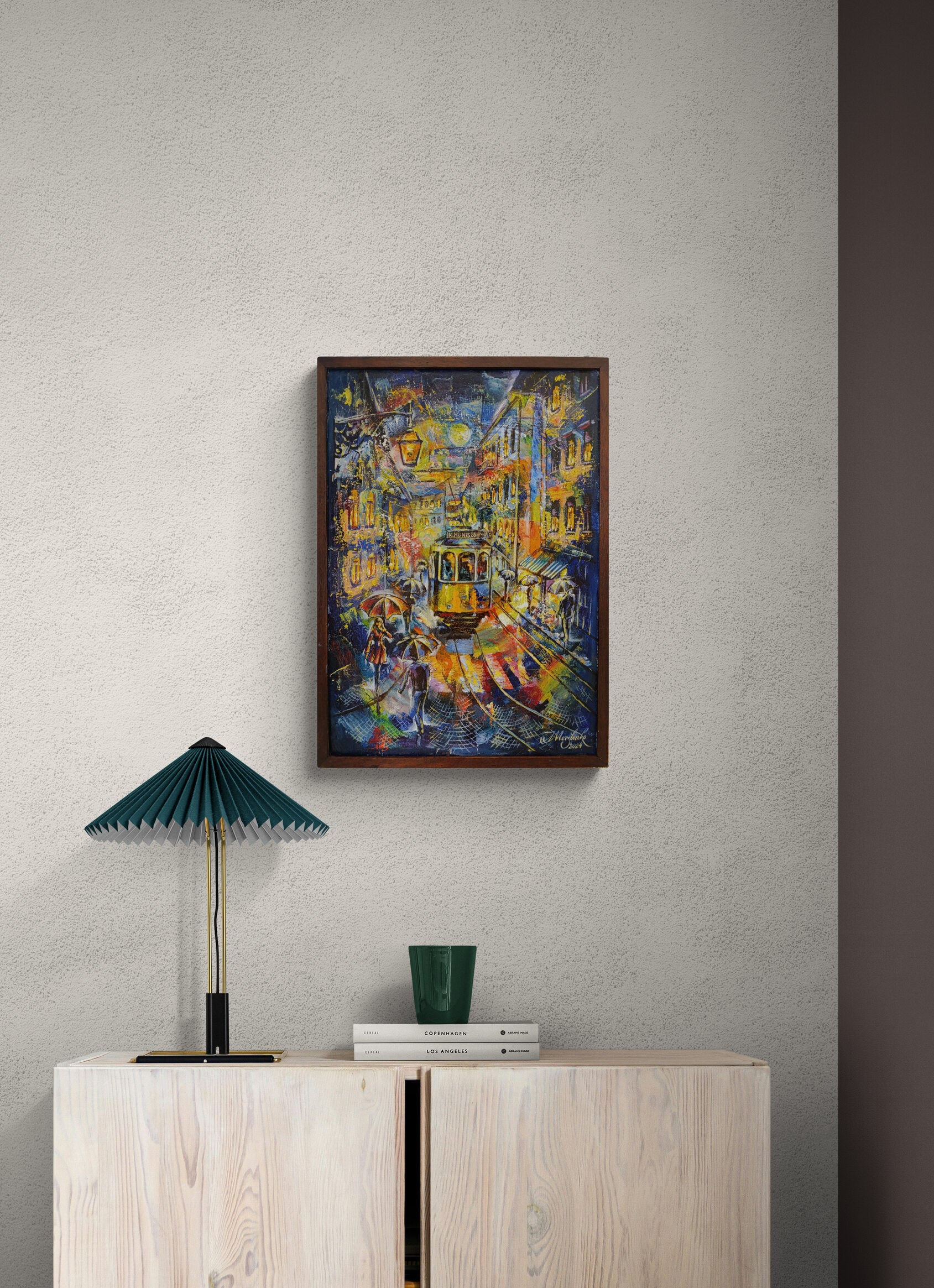 The vibrant energy of an evening cityscape, with a tram at the center, illuminated by the glow of streetlights and neon signs. The painting bursts with color, dominated by yellows, blues, and fiery oranges, which reflect on the wet streets, creating a lively interplay of light and texture. Pedestrians holding umbrellas walk along the cobblestone streets, while a soft moon glows in the background, adding a dreamy, almost surreal atmosphere. The thick, expressive brushstrokes and vibrant palette infuse the scene with movement and life, as the night unfolds in this dynamic urban setting.