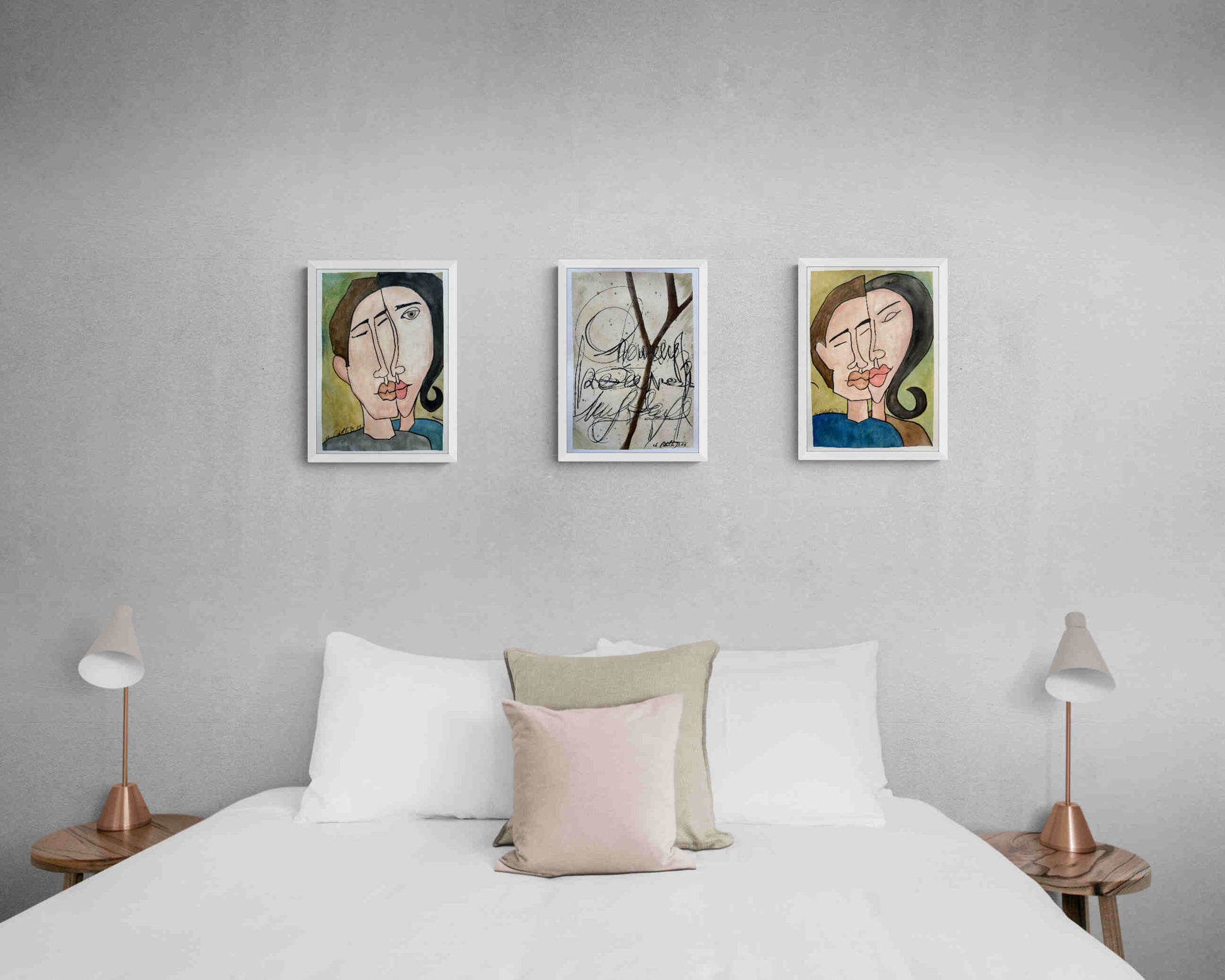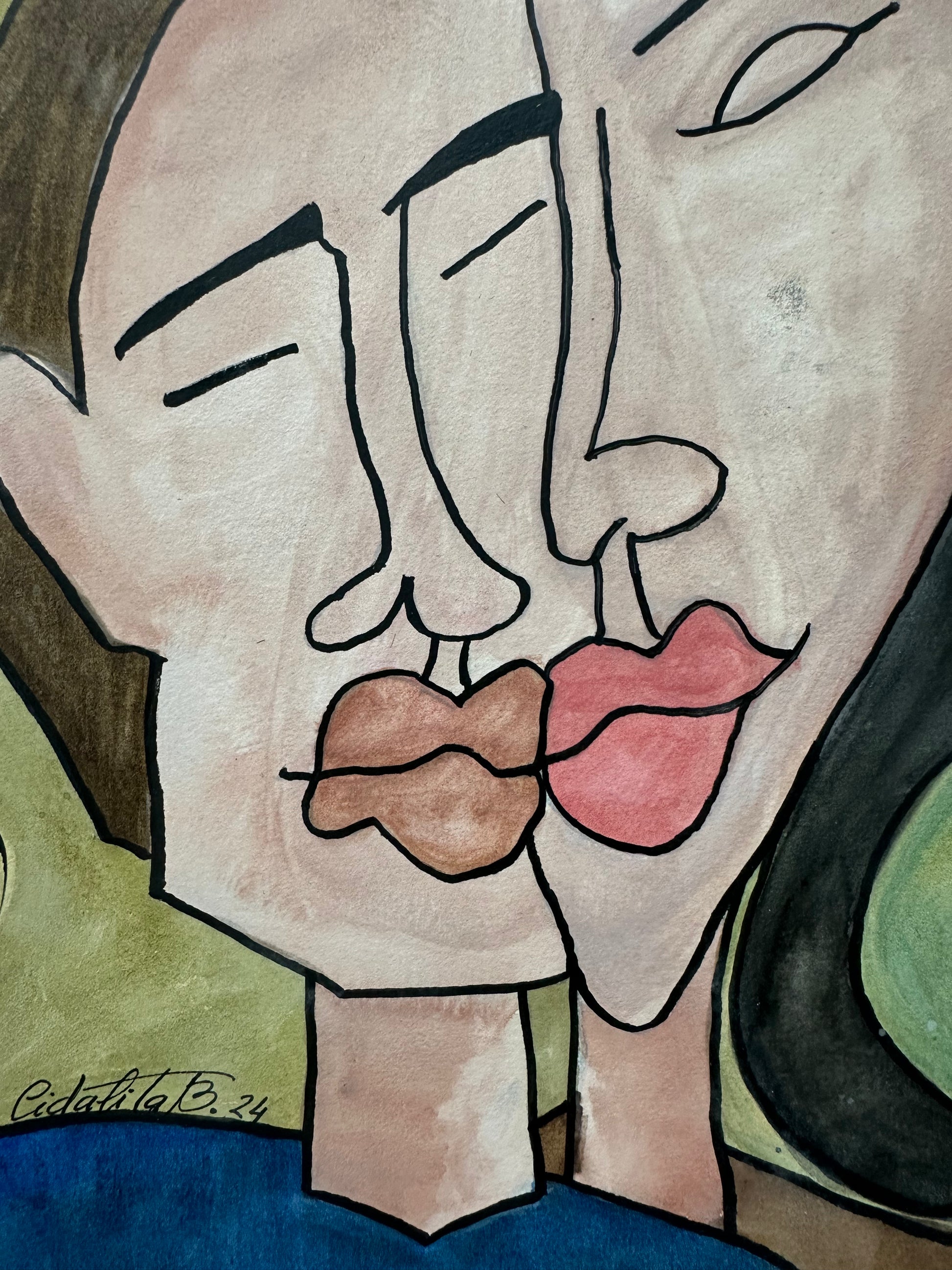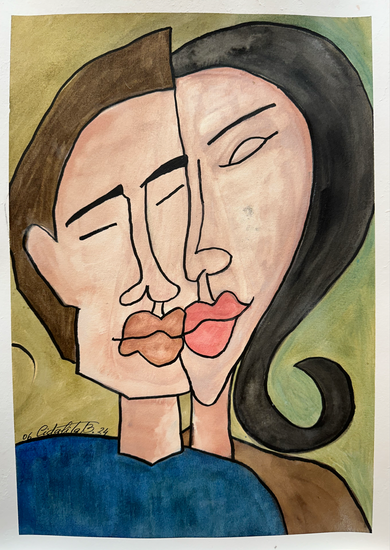 This painting features two faces, their features merging in an abstract dance of shapes and colors. The work explores themes of connection and unity.
