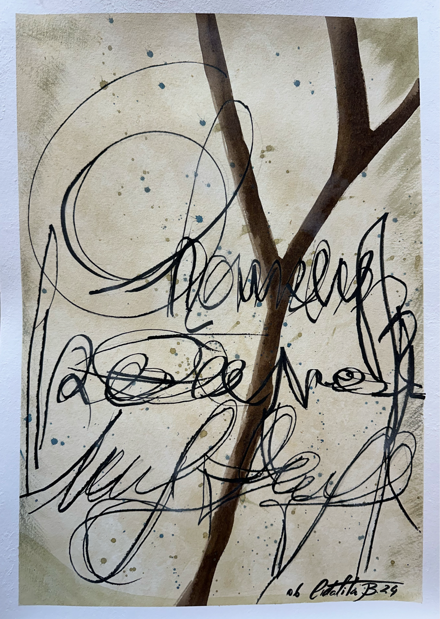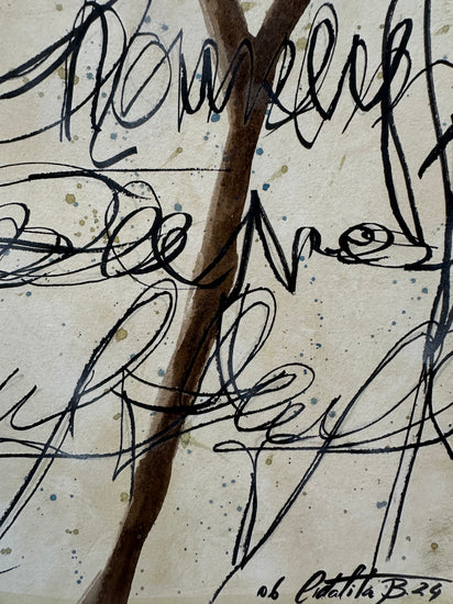 Combining calligraphy and abstract elements, this artwork symbolizes nature's silent communication through a tree-like form. The spontaneous ink strokes suggest movement and growth.