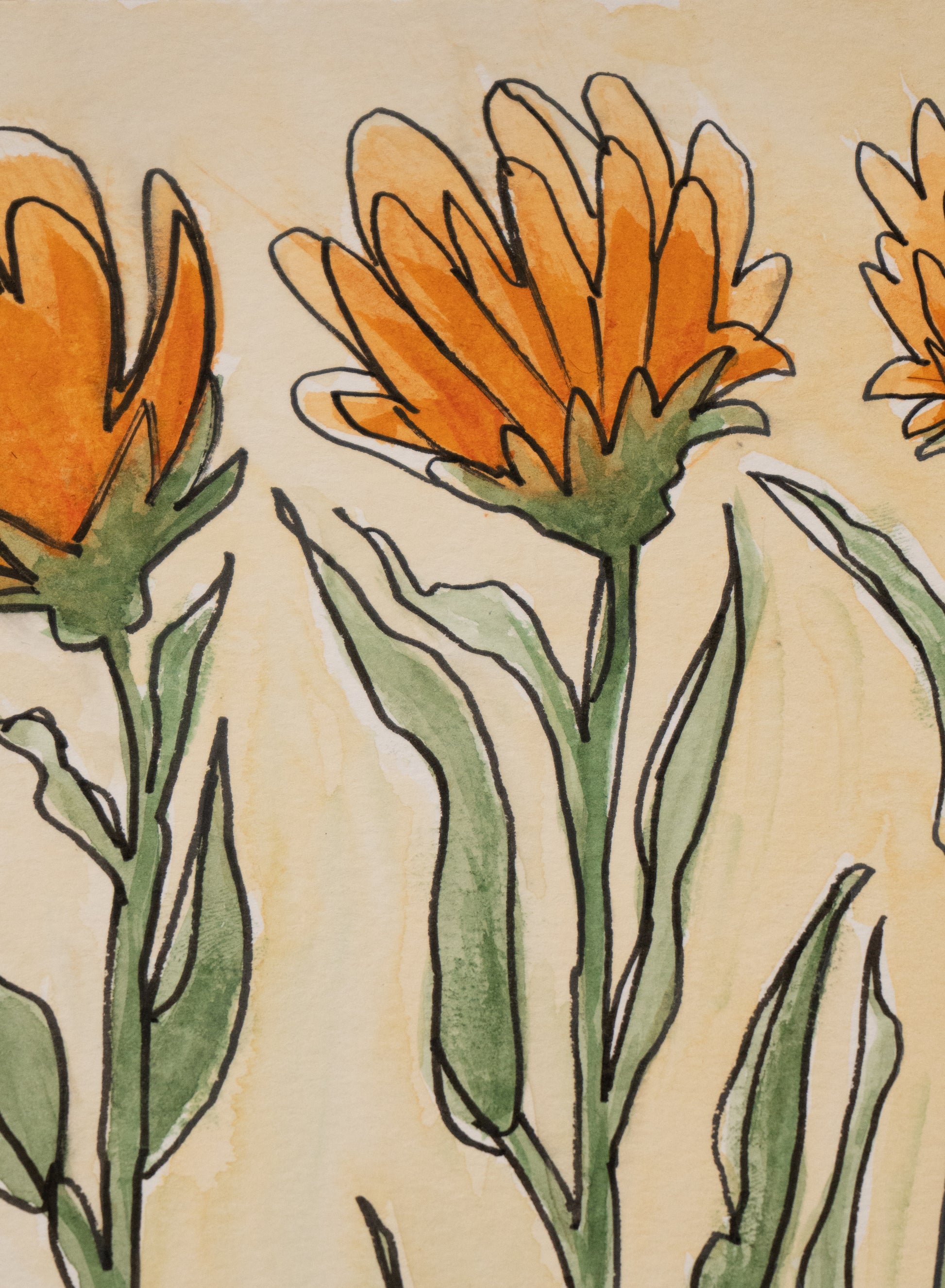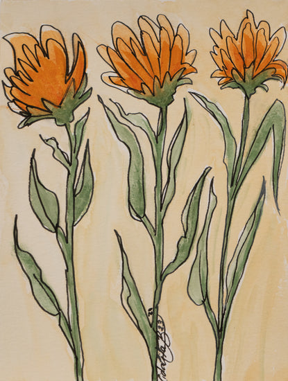 This painting features a cluster of vibrant calendula flowers, rendered with lively strokes and vivid colors that capture the essence of spring. The artwork exudes joy and the rejuvenating spirit of nature, showcasing the beauty of blooming flowers.