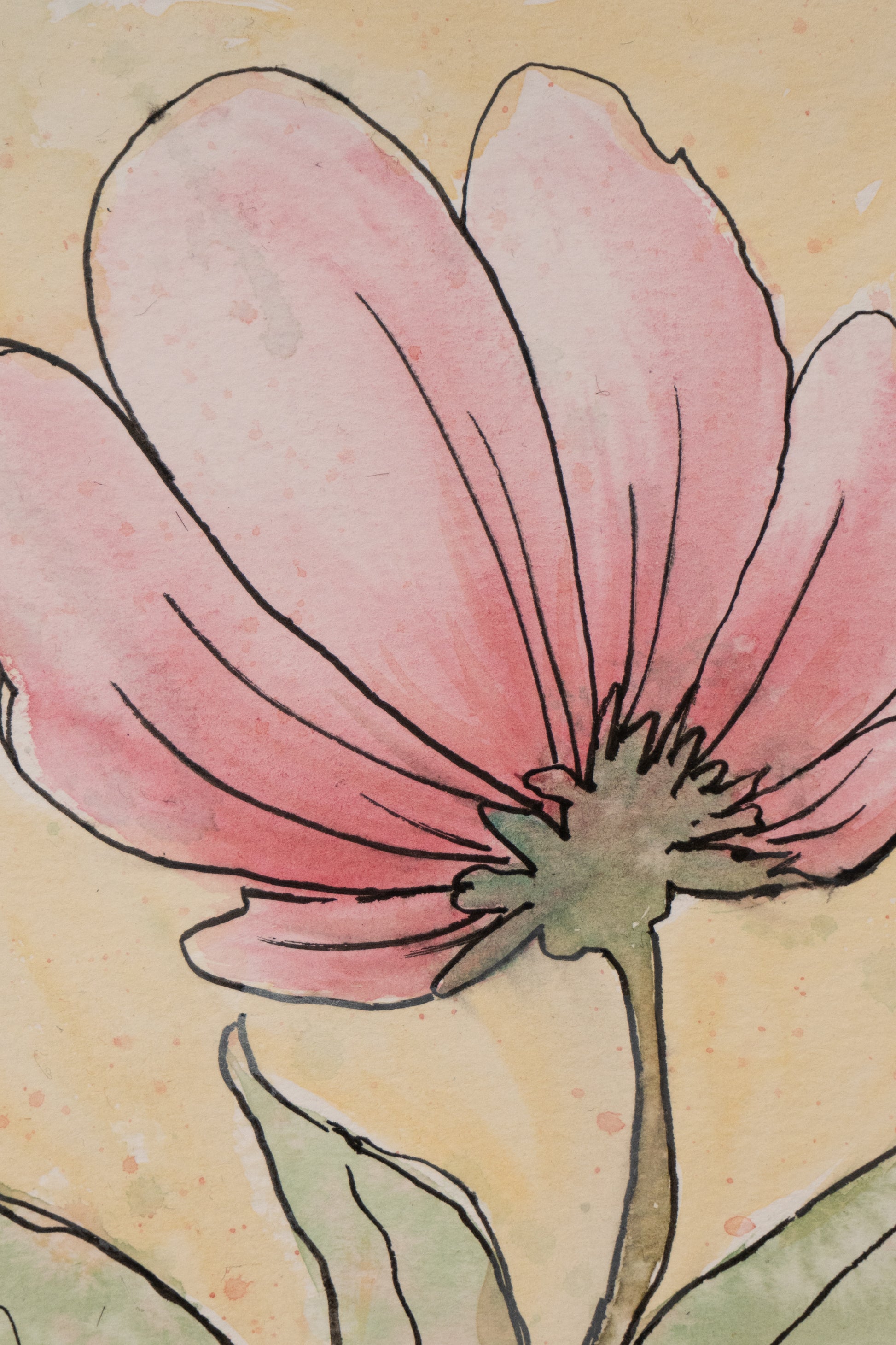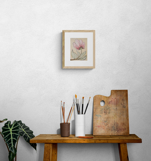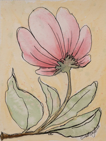 The painting focuses on a single pink flower, beautifully detailed to highlight its delicate petals and vibrant green leaves. The soft background complements the subtle shades of the flower, emphasizing its elegance and natural grace.
