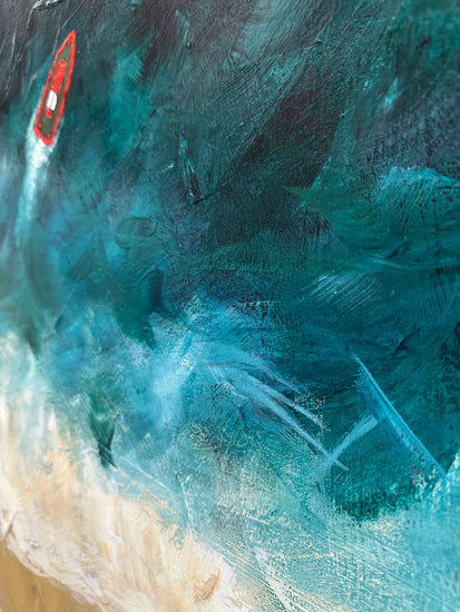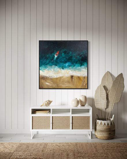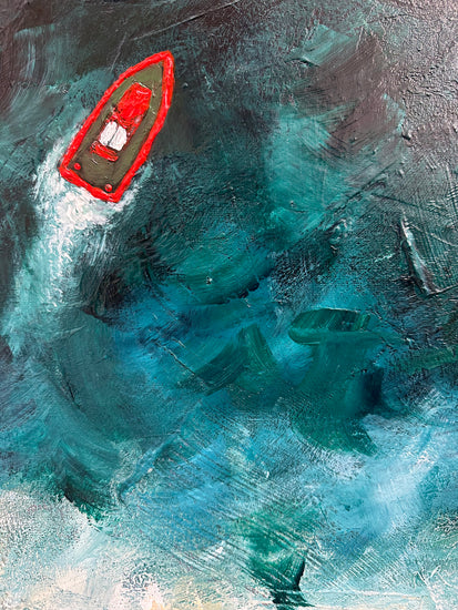 This evocative painting depicts a small red boat adrift in a vast, turbulent ocean. The contrast between the dark, stormy waters and the bright red of the boat creates a dramatic focal point.