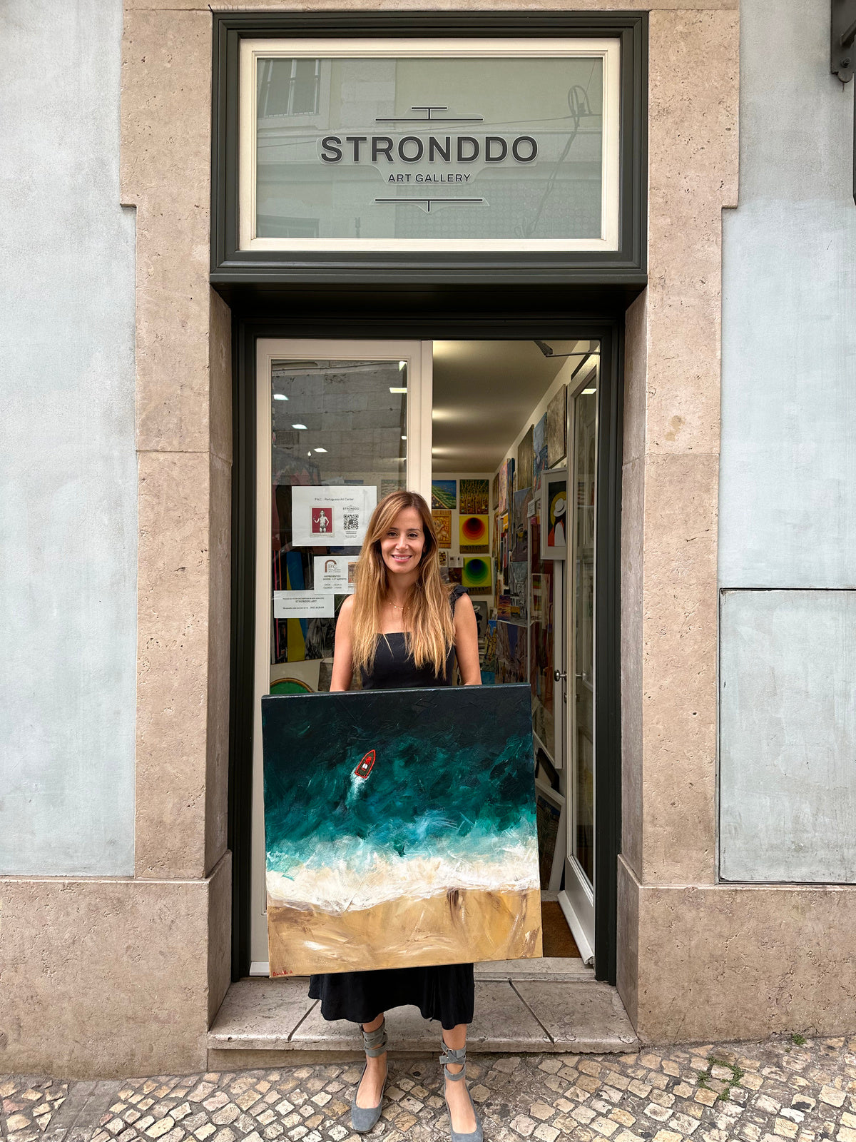 The sandy shore at the bottom adds a grounding element, suggesting the boat's journey from land to the unpredictable sea.