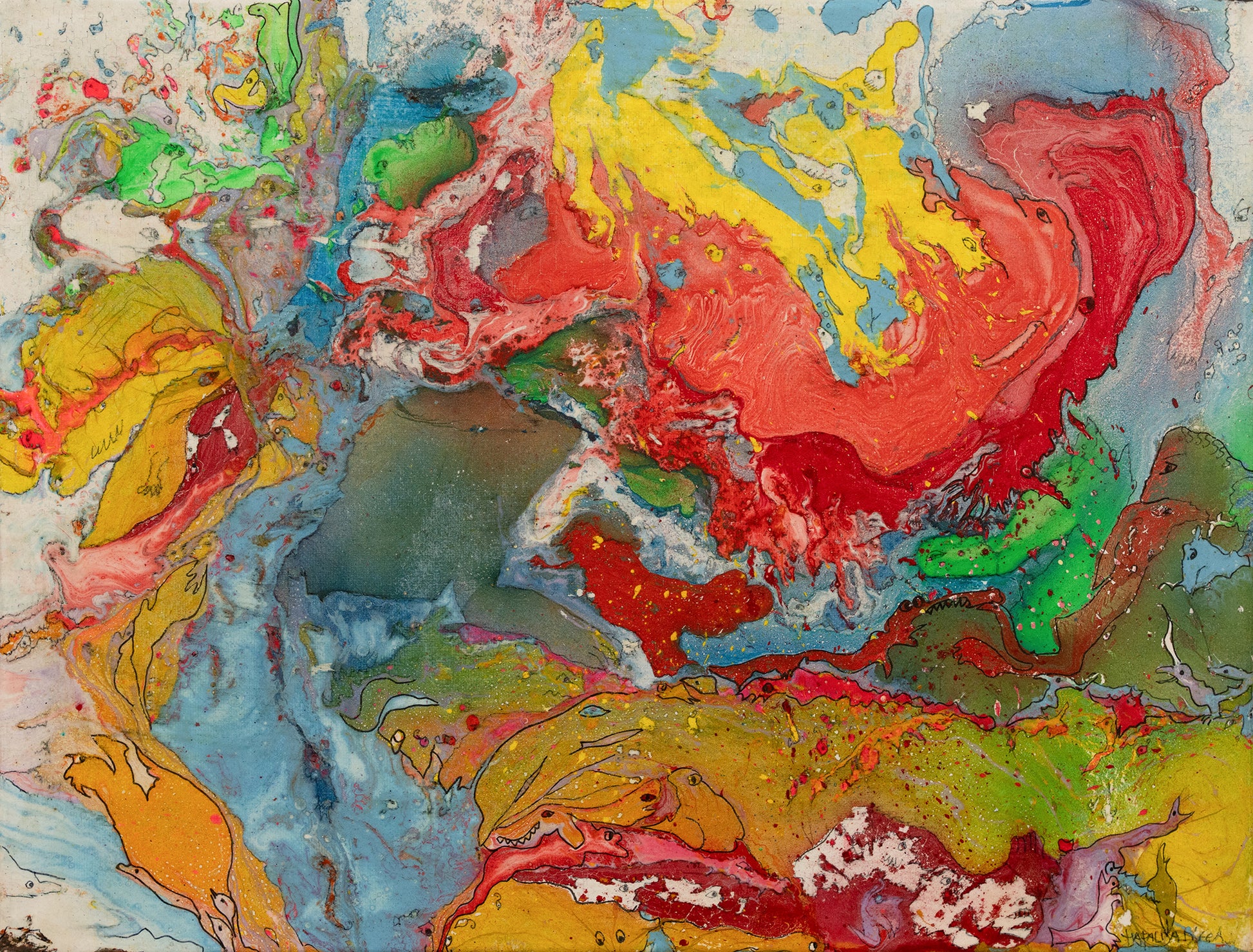 This abstract painting evokes the serene and mesmerizing beauty of the ocean. The composition is dominated by soothing shades of blue, punctuated by vibrant splashes of orange, green, and white. The fluid, sweeping brushstrokes and layered textures create a sense of depth and movement, capturing the tranquil yet dynamic essence of the sea.