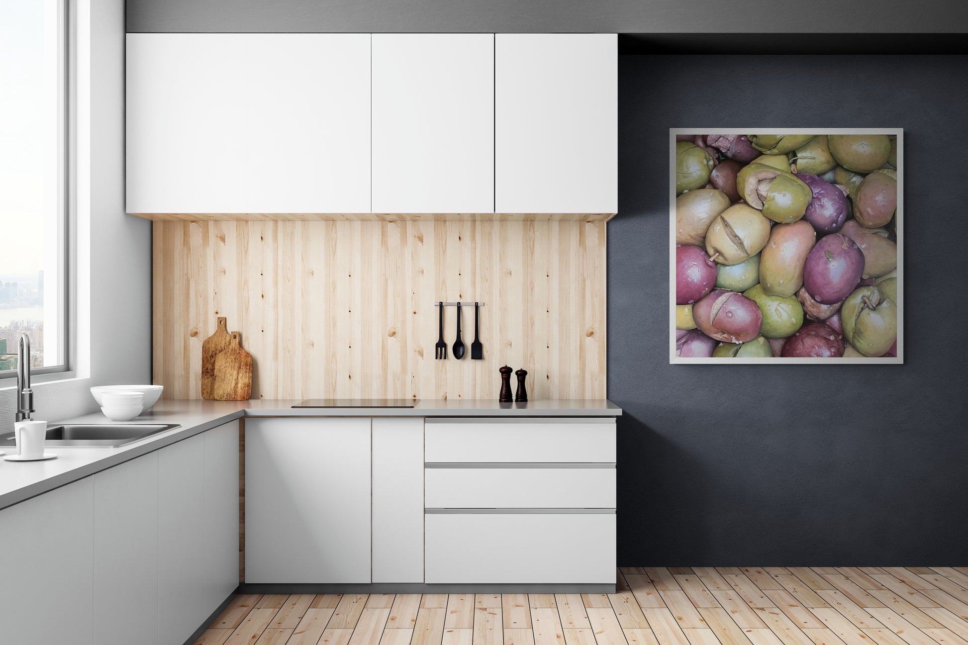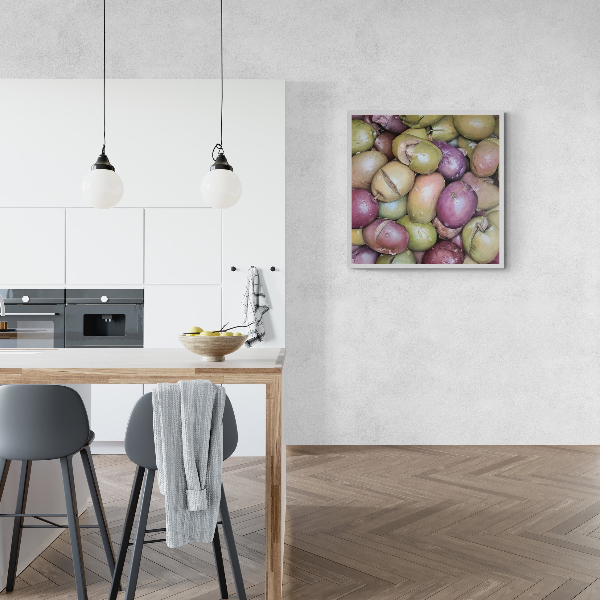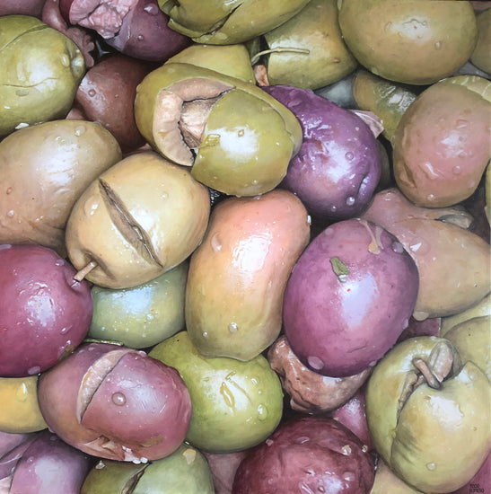 A hyper-realistic painting depicting a collection of plump, freshly harvested olives in shades of green, purple, and brown. The detailed textures and the glistening sheen of moisture on the olives highlight their ripeness and natural beauty.