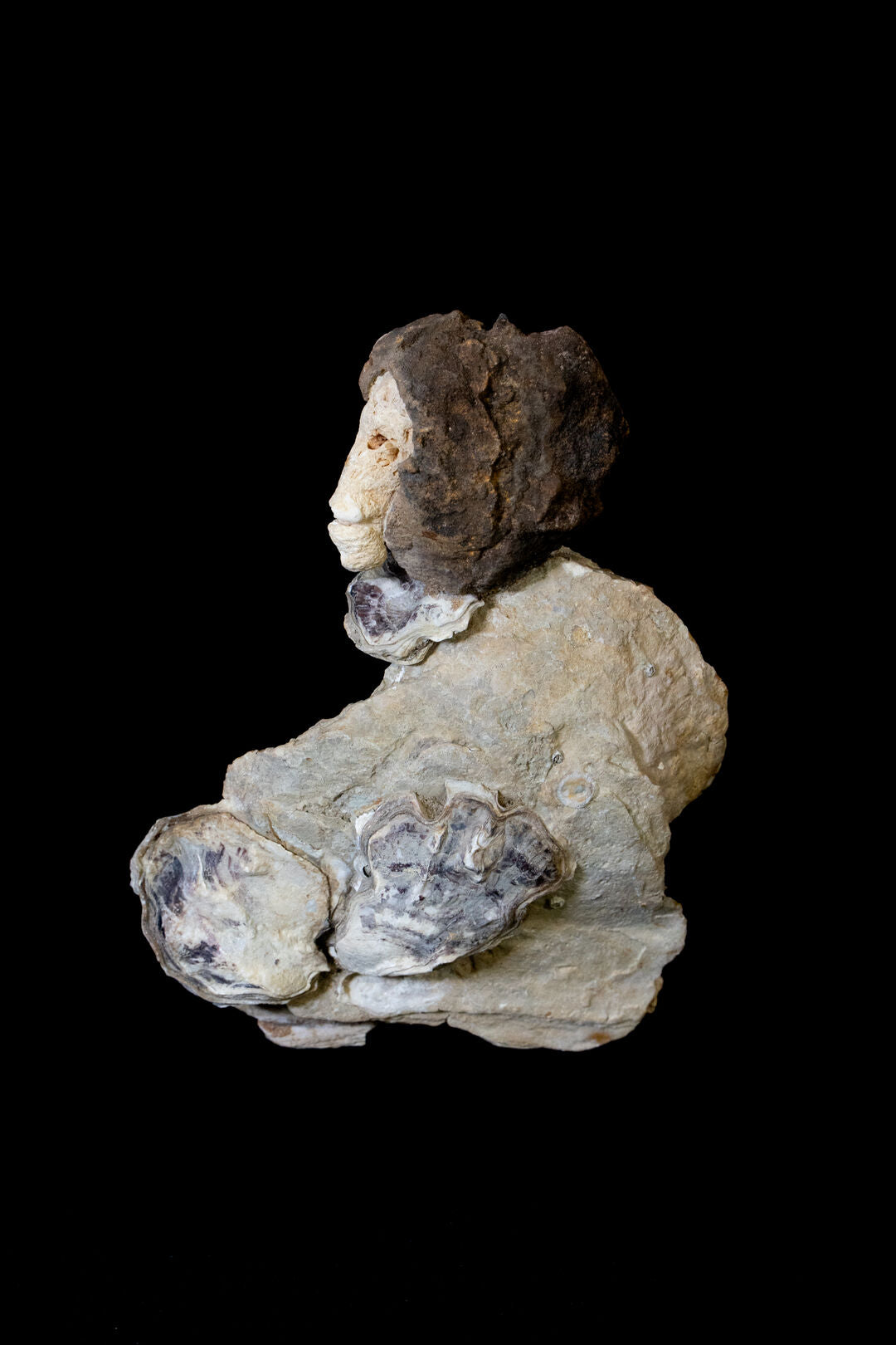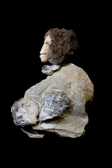 A captivating sculpture that blends natural elements with a refined human profile, creating a figure that appears to emerge from the earth and sea. Constructed from rough stone and oyster shells, the piece presents a contemplative face framed by textured, rock-like hair. The layers of shells adorning the figure’s body add an organic depth, symbolizing wisdom, growth, and the mysteries hidden beneath the surface. This sculpture feels timeless and grounded, evoking a sense of resilience and connection to nature. It invites viewers to reflect on the harmony between humanity and the natural world, where both the roughness of stone and the delicate beauty of shells coexist in balance.