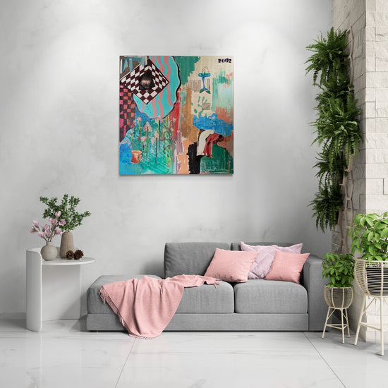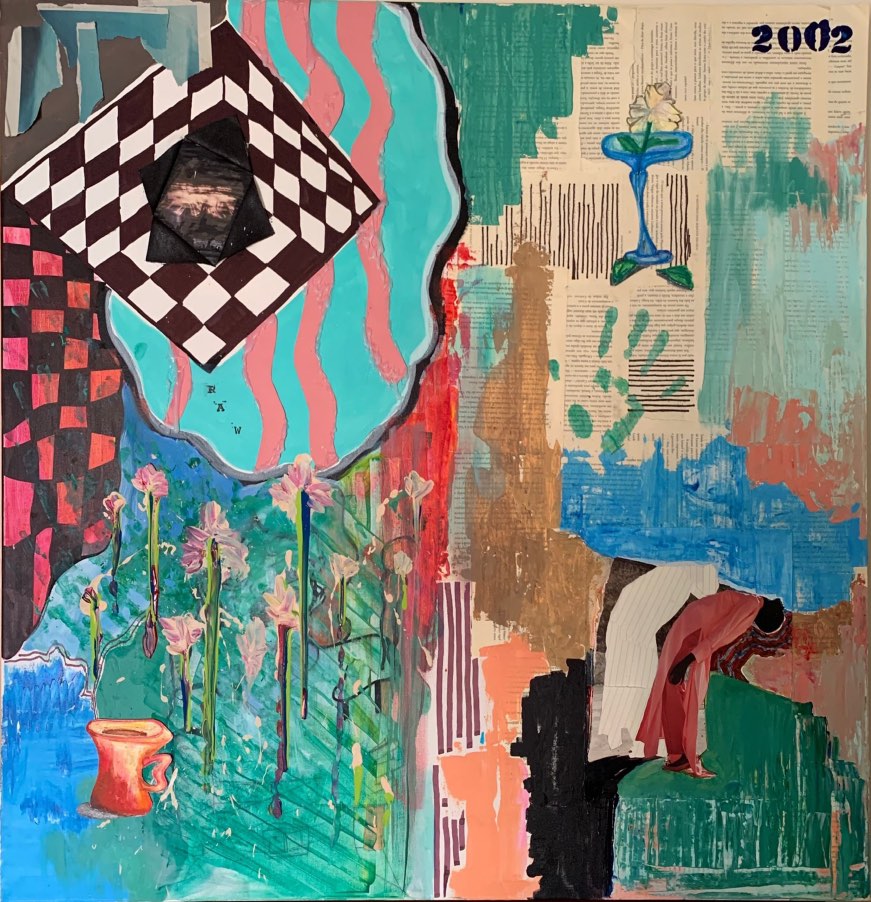 On the right side of the painting, the background is made up of a collage of textured, printed paper with paint splatters in green, blue, and peach. A blue stem with a white flower on top appears in the upper right, while the number "2002" is printed in bold black letters nearby.