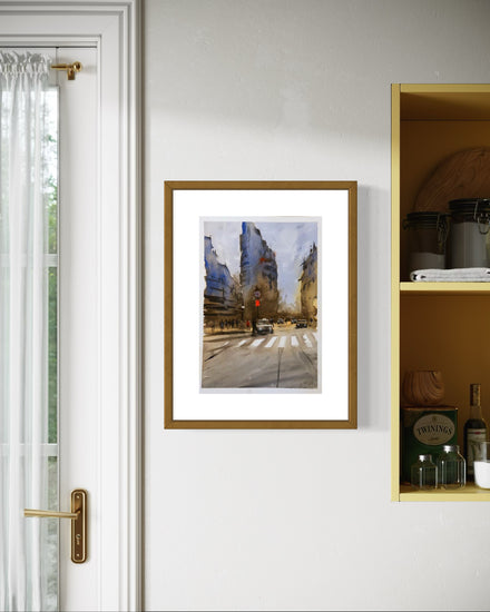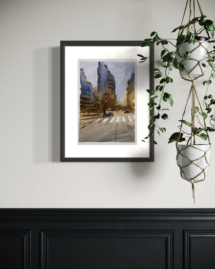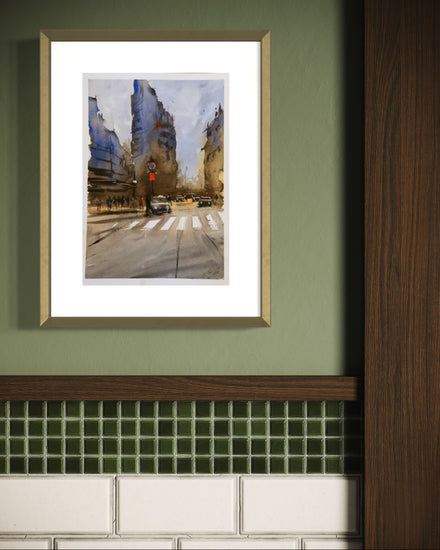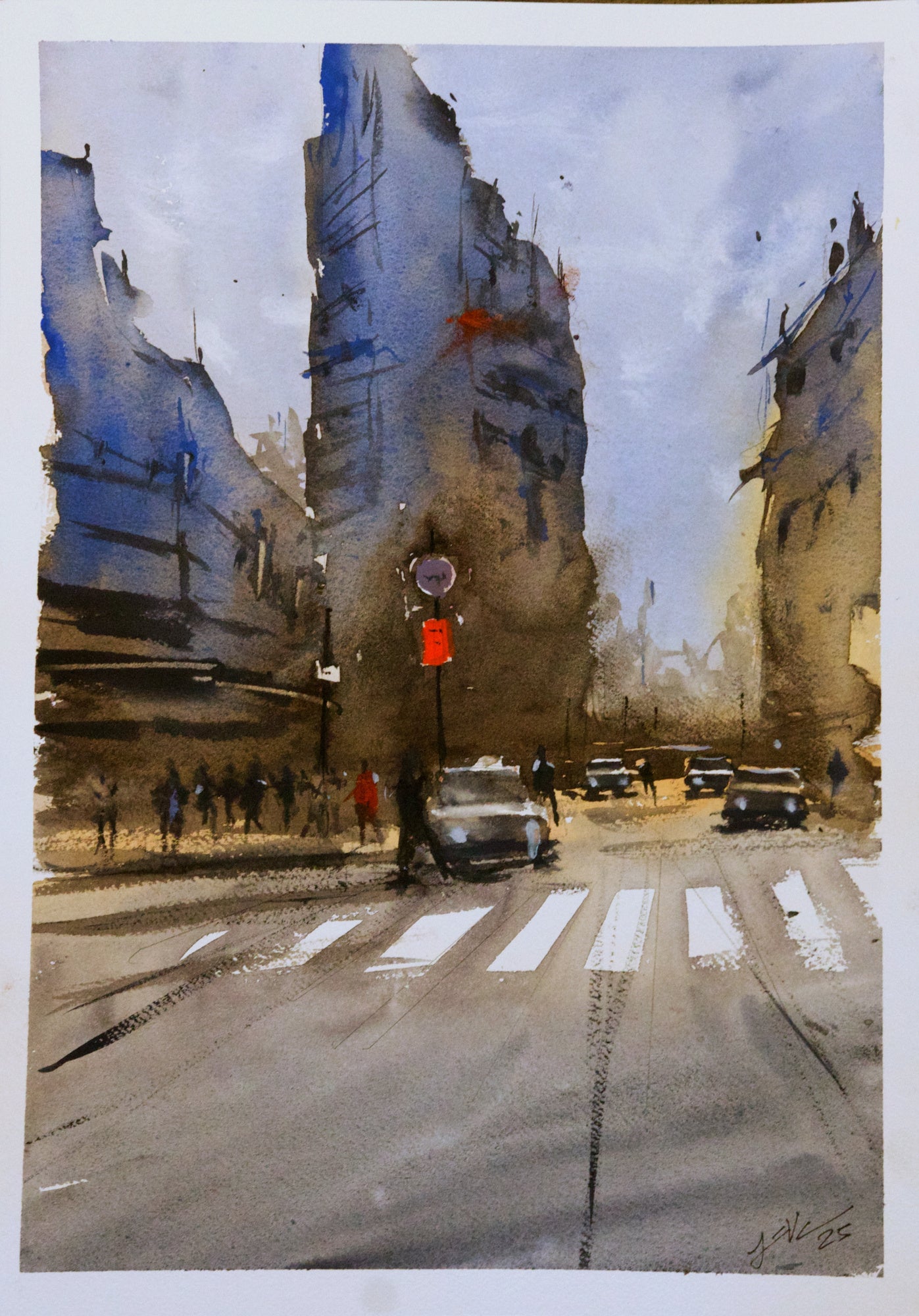 A dynamic urban scene depicted with loose, impressionistic watercolour strokes, capturing the energy of a bustling intersection surrounded by towering buildings.