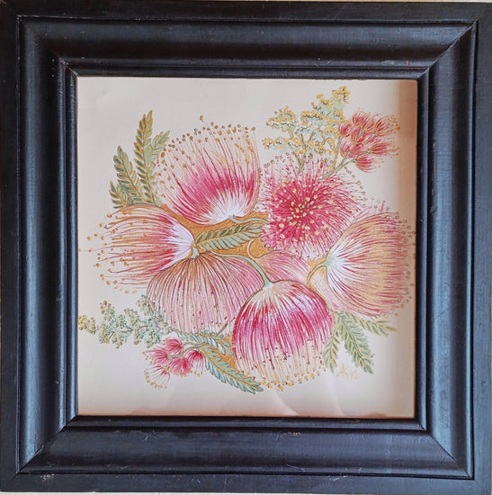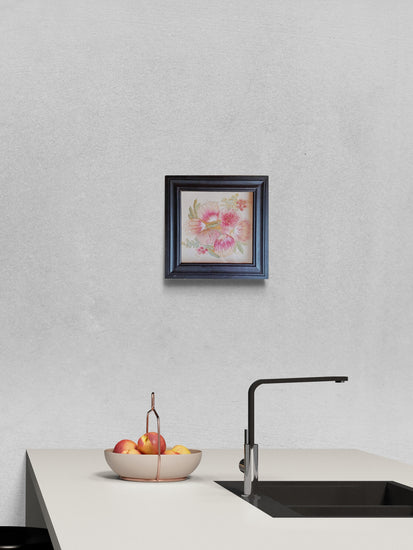 This captivating botanical illustration of vibrant flowers with delicate, fine lines and a soft color palette, primarily featuring shades of pink and green. The floral arrangement is framed in a simple black frame, which contrasts nicely with the artwork, making the colors stand out even more.