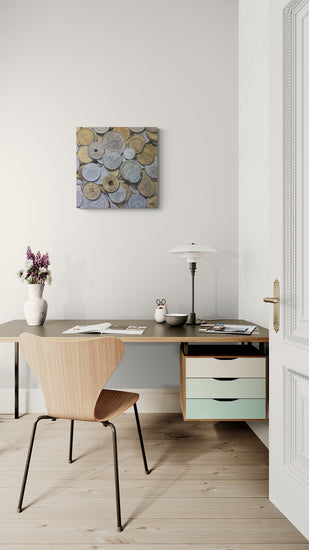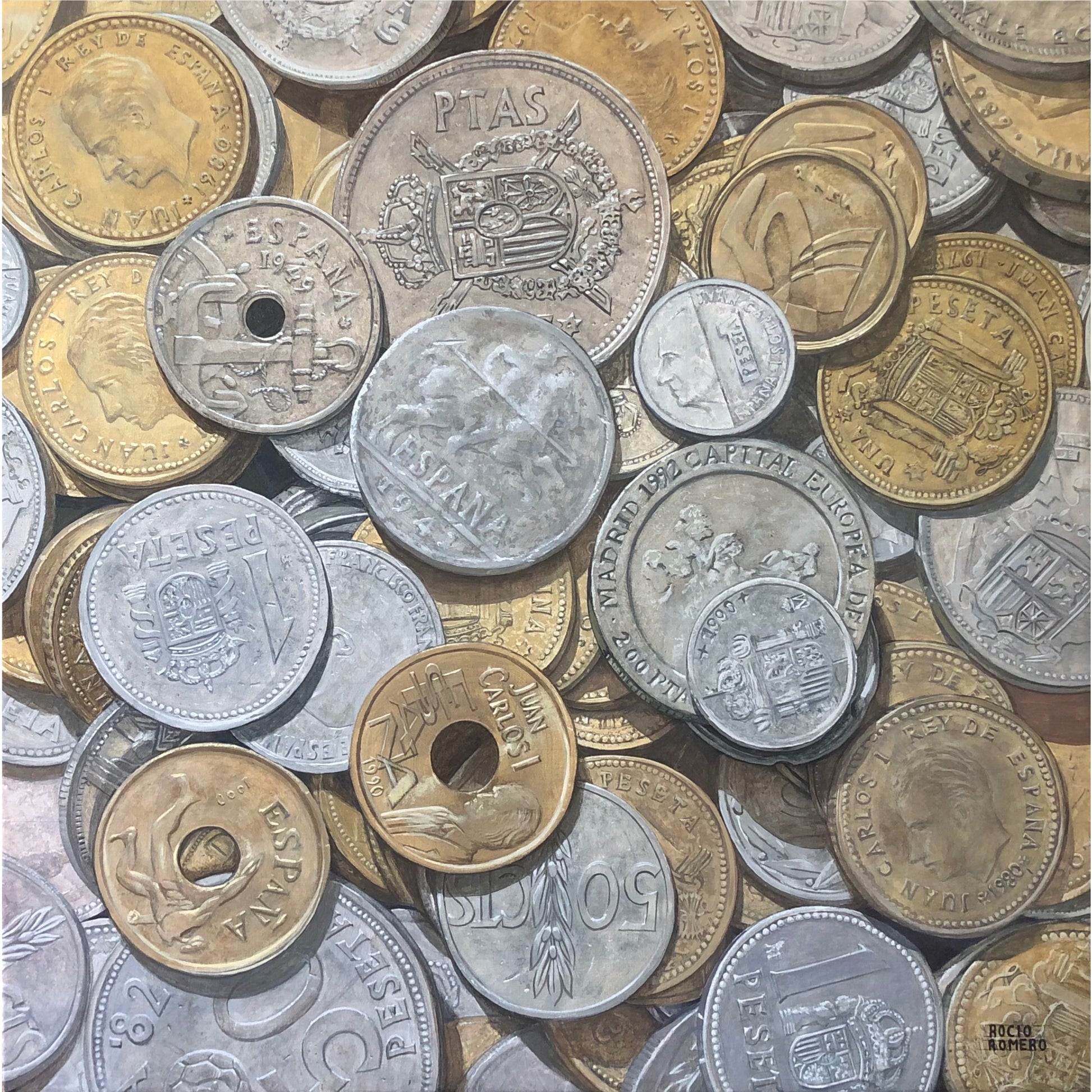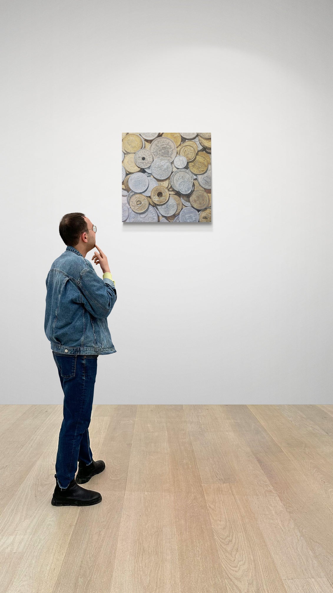 A hyper-realistic painting depicting a collection of plump, freshly harvested olives in shades of green, purple, and brown. The detailed textures and the glistening sheen of moisture on the olives highlight their ripeness and natural beauty.