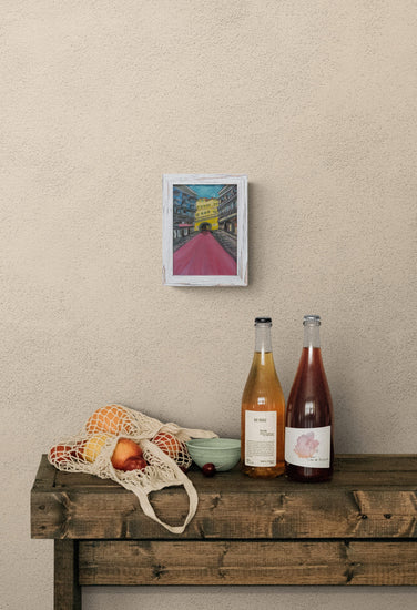 A cityscape scene with a dynamic use of color and perspective. The foreground is dominated by a bold pink pathway that leads the eye straight into the yellow archway, creating a sense of depth and movement. The surrounding buildings are depicted in darker tones of grey and blue, contrasting with the bright focal points of the painting, adding to the sense of structure and urban life. The yellow arch, illuminated by the sunlight against a bright blue sky, draws attention to the distance, inviting the viewer to imagine what lies beyond. The rich palette give the city a vibrant, almost dreamlike atmosphere, reflecting both the vibrancy and mystery of urban spaces.