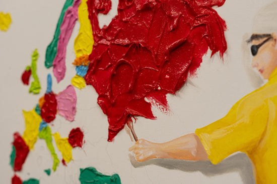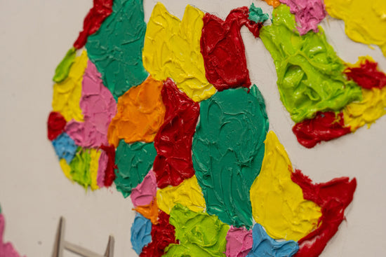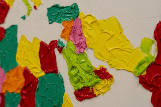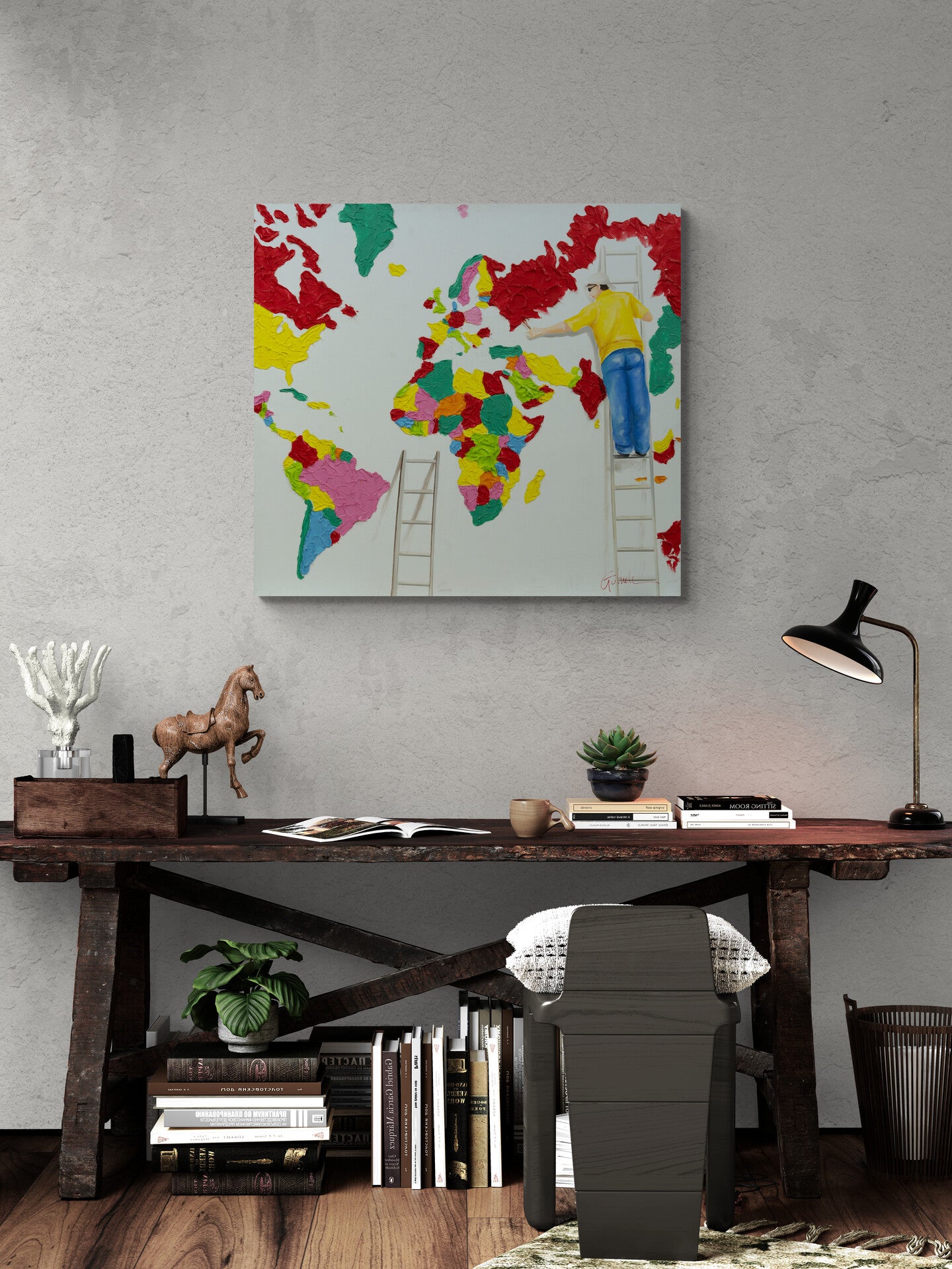 A playful yet profound image of an artist actively painting a vibrant, textured world map. The artist, perched on a ladder, adds details with a brush, as if shaping the world itself. This artwork conveys themes of creativity, connection, and unity, highlighting the act of constructing and reimagining our global landscape. The vibrant colors and impasto technique emphasize the diverse and dynamic nature of our world, inviting viewers to reflect on the roles of individuals in shaping collective identity.