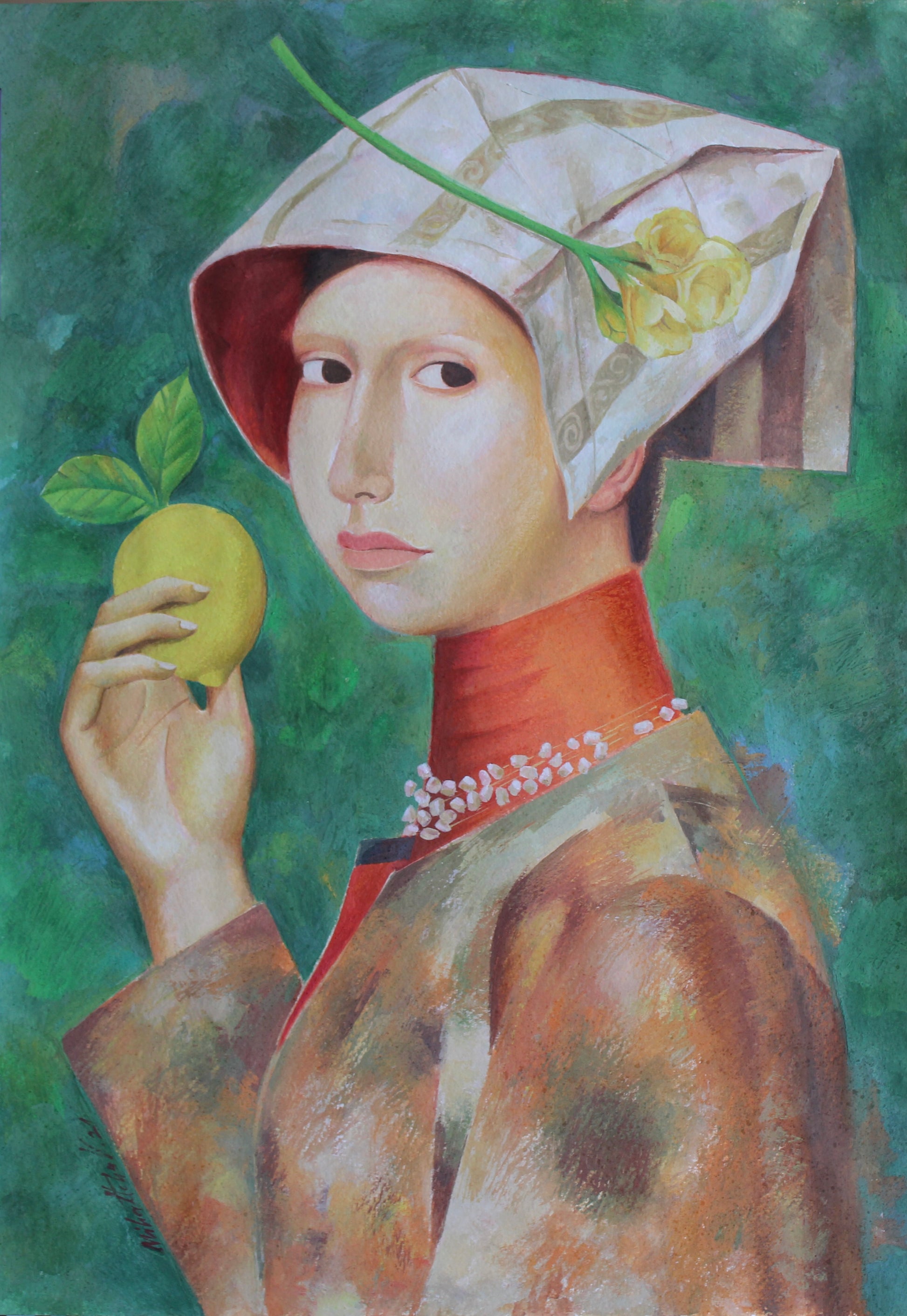 A captivating portrait featuring a woman holding a lemon, her expression serene and introspective. The detailed textures and soft color palette create a harmonious blend of realism and abstraction.