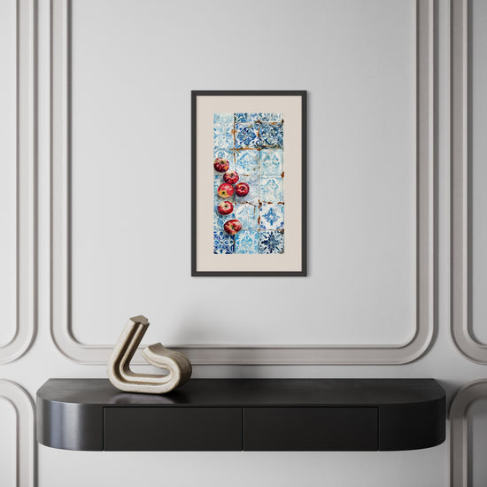 The intricate watercolor layers capture a striking contrast between the deep tones of the fruit and the cool, weathered blues of the ceramic-inspired background.