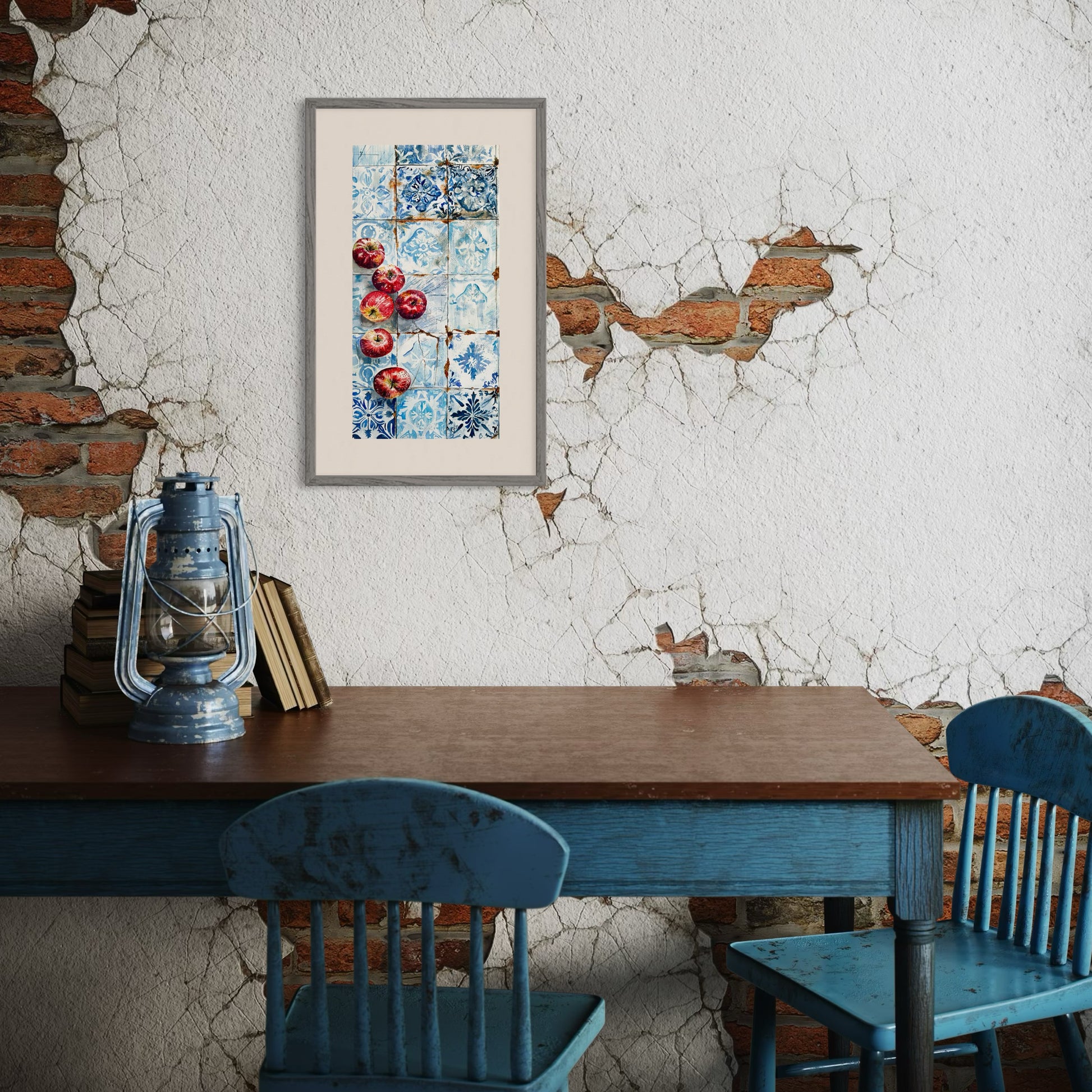 A vibrant still life composition of rich red apples set against an aged azulejo-tile pattern, evoking both Portuguese heritage and rustic charm.