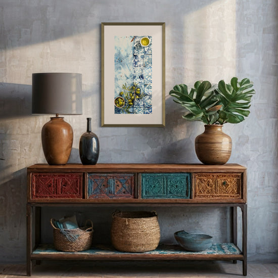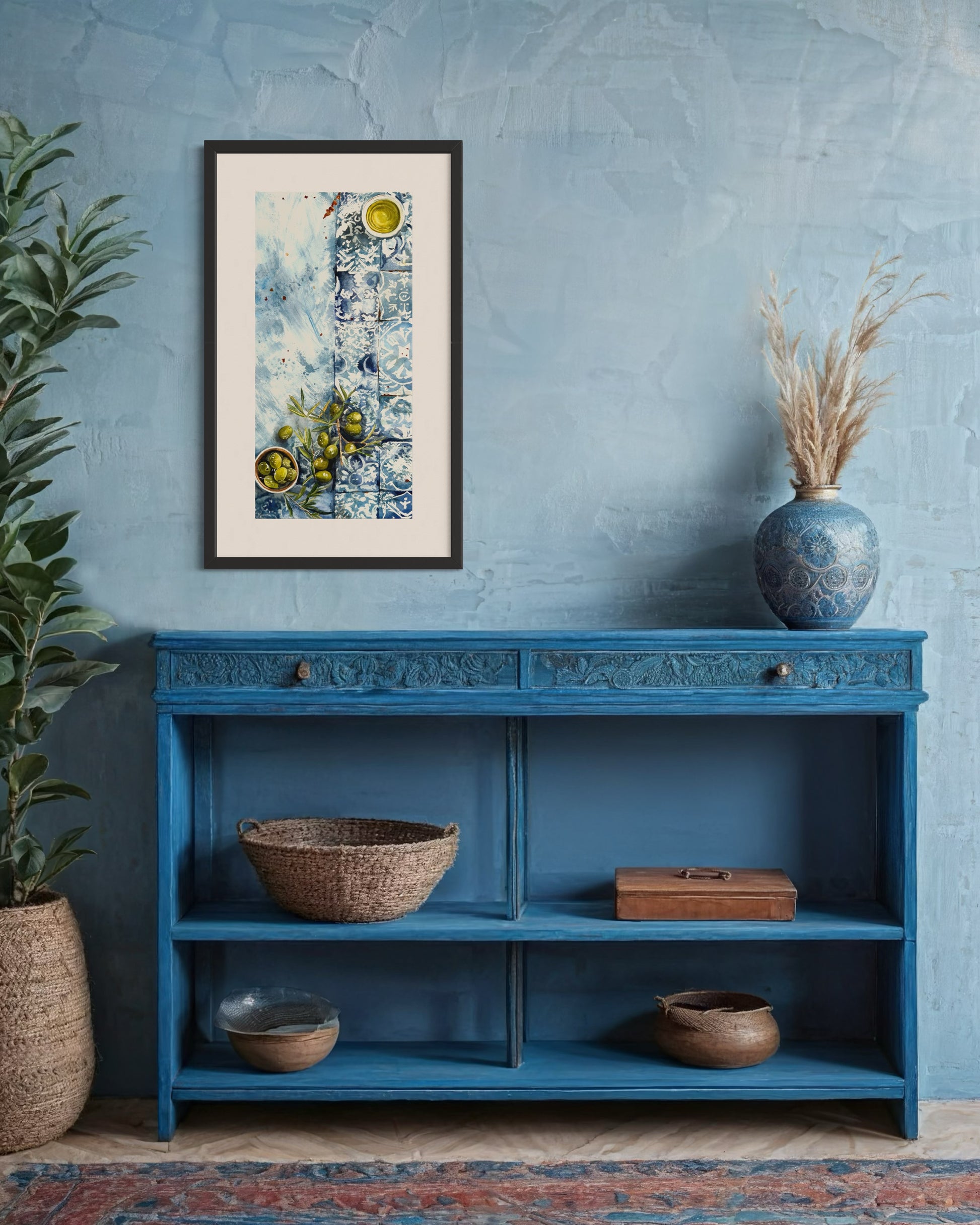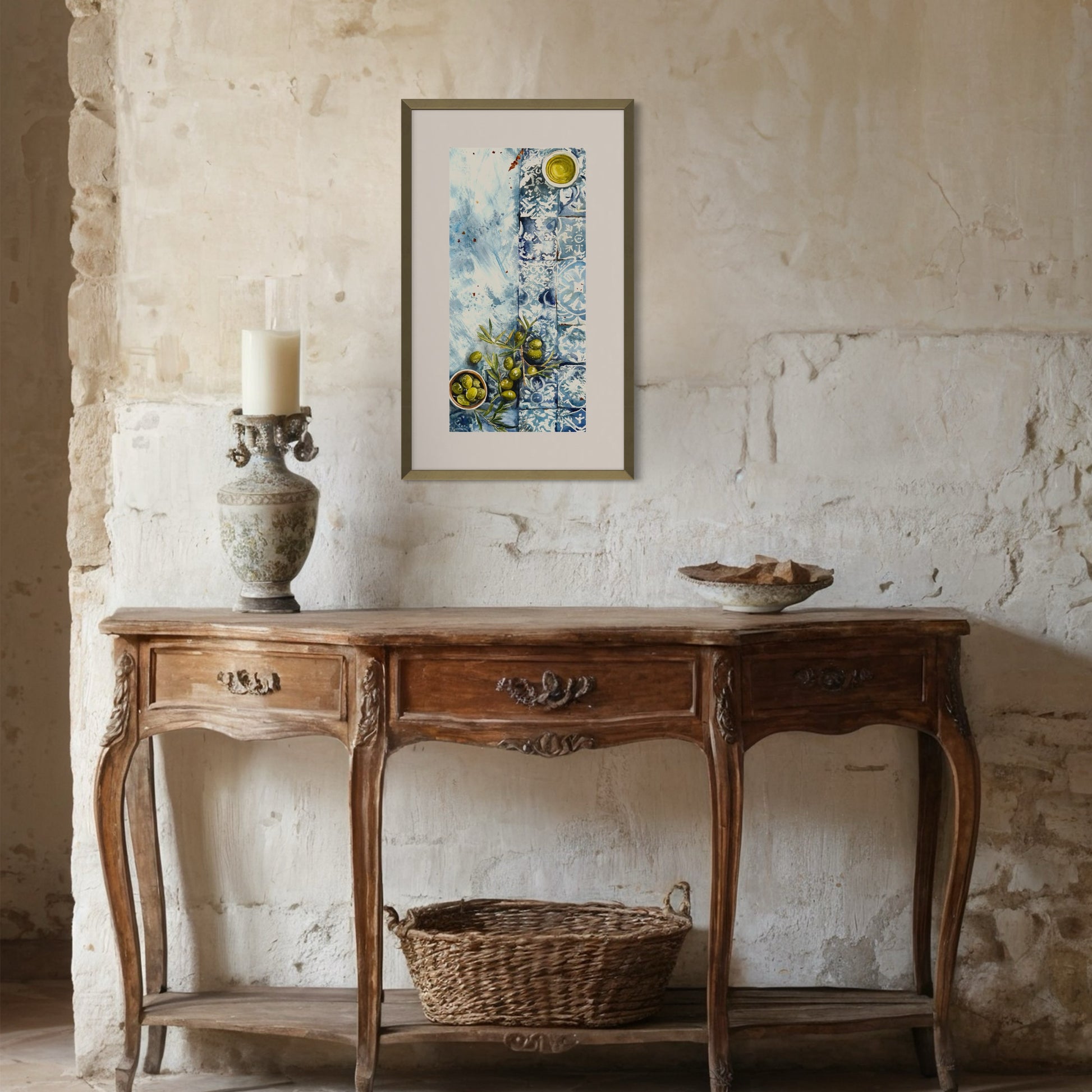 A refined still-life composition featuring green olives and a small bowl of olive oil set against a richly patterned blue-and-white tile background, echoing Portuguese azulejos.