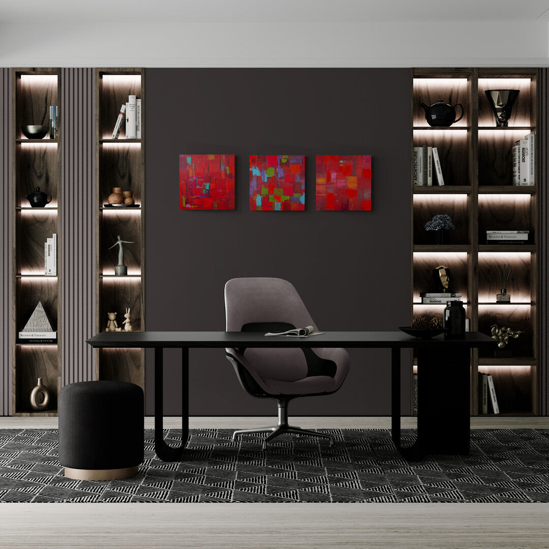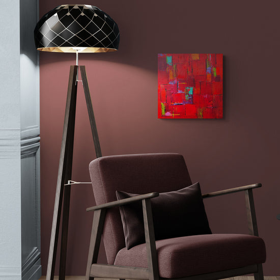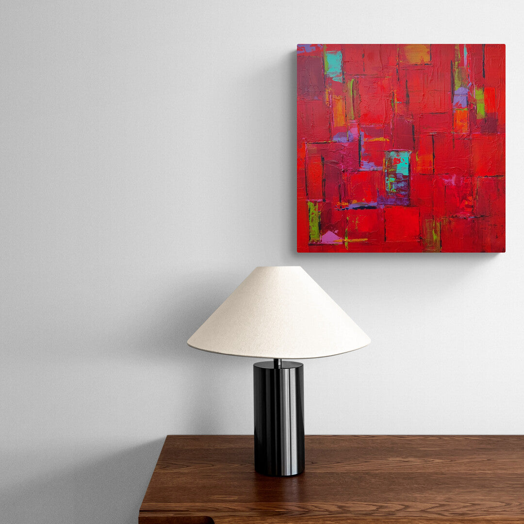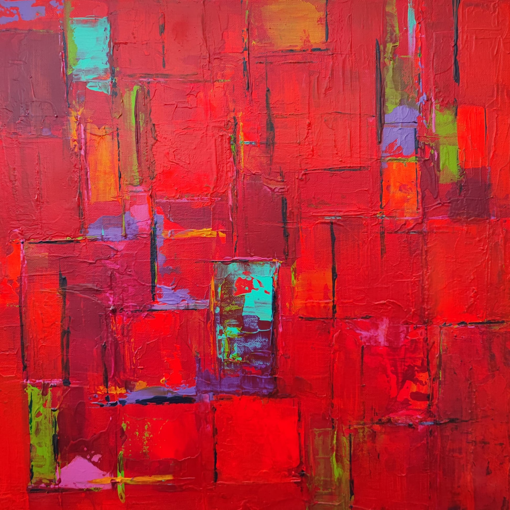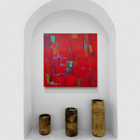 A bold and dynamic abstract painting dominated by rich red hues with accents of turquoise, purple, and orange. The textured layers and geometric patterns create a sense of depth and energy, evoking the intensity and passion of a glowing ember.