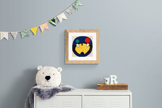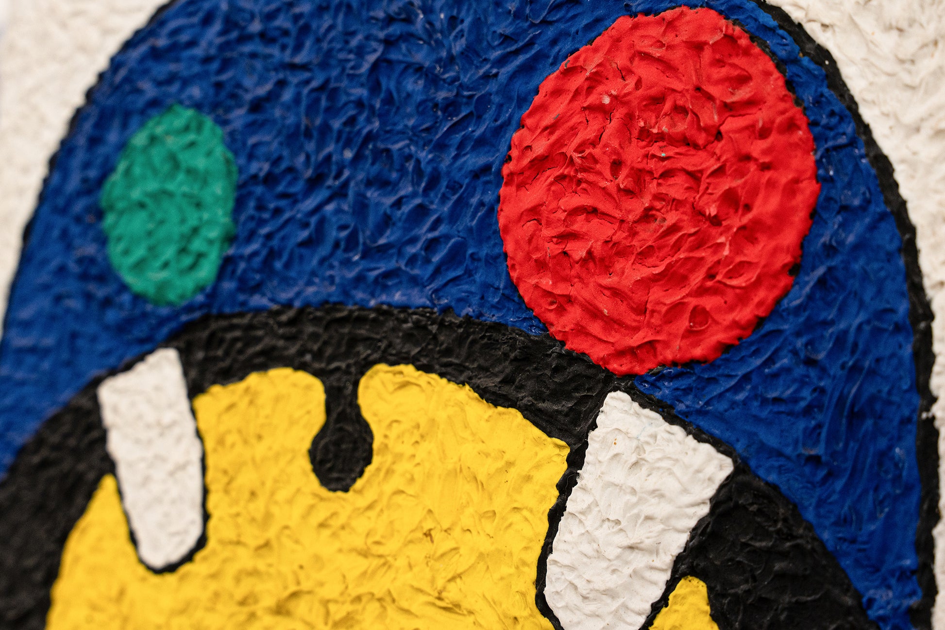 A bold, textured piece featuring a central yellow form flanked by blue and black circular patterns, with red and green accents creating a playful abstract composition.