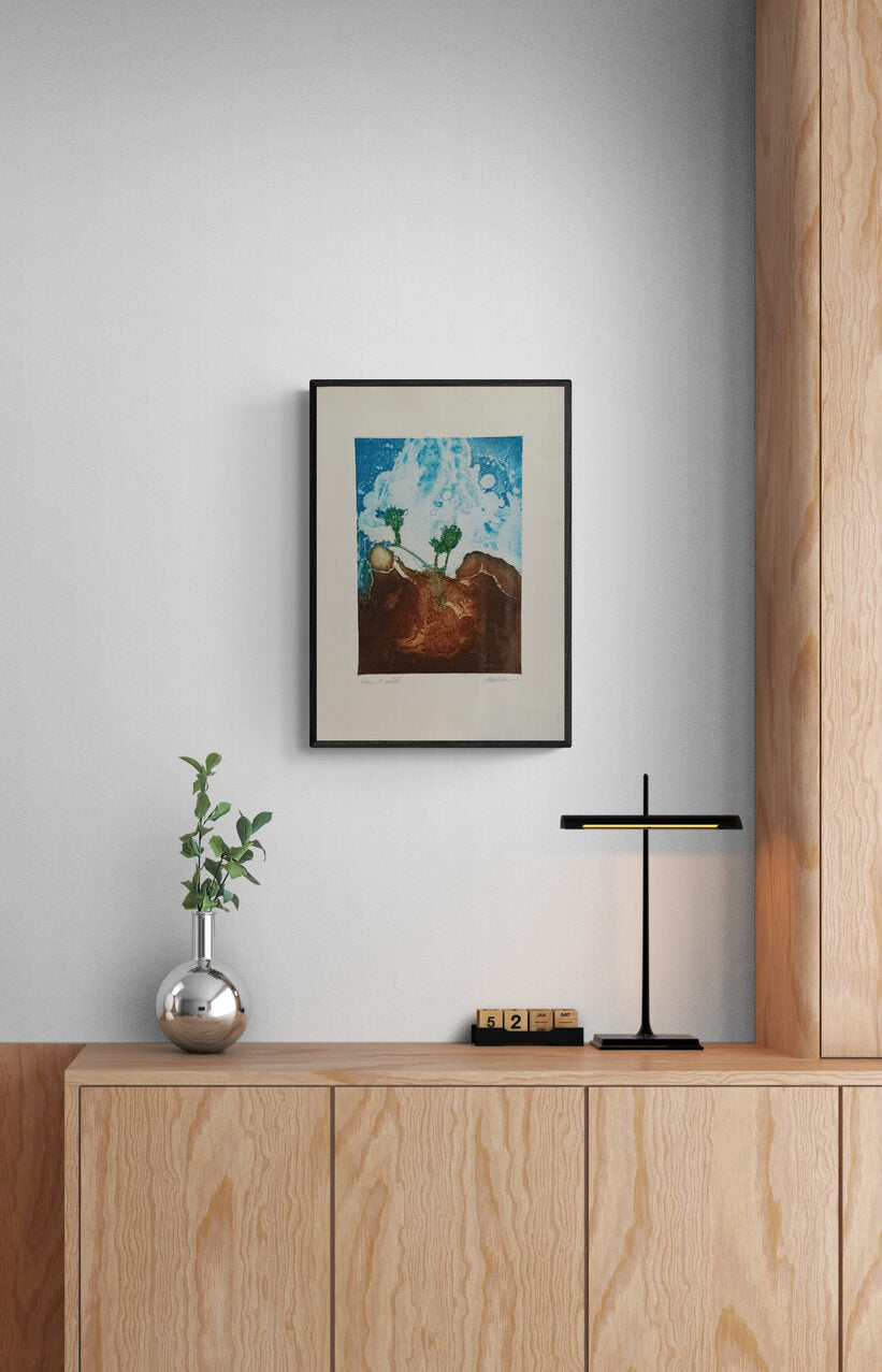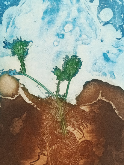 With a focus on the contrast between earthly roots and surreal sky elements, the piece depicts plant roots stretching through the soil, representing growth and nature's strength. The texture-rich brown tones of the earth juxtaposed against the swirling blues of the abstract sky create a dreamlike atmosphere. The depth and detail in the plant forms provide a delicate contrast to the flowing, ethereal background.