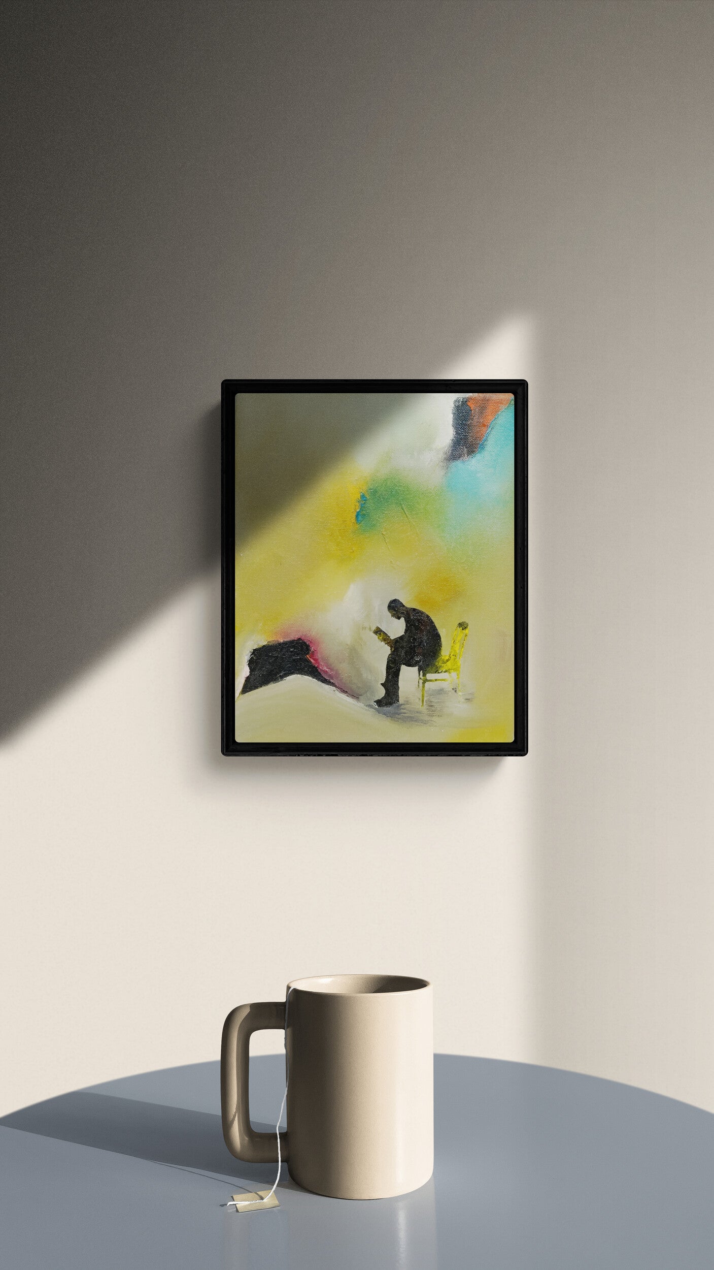 This thought-provoking painting features a lone figure seated on a bright yellow chair, deeply engaged in reading. Set against an abstract, softly blended background of warm and cool tones, the composition creates a sense of peaceful isolation and introspection. The juxtaposition of the vivid chair and the silhouetted figure highlights the solace found in solitary moments, making it a perfect addition to spaces that celebrate mindfulness and the quiet joys of personal reflection. Ideal for study rooms, personal libraries, or any tranquil environment, this artwork adds a touch of calm and intellectual depth.