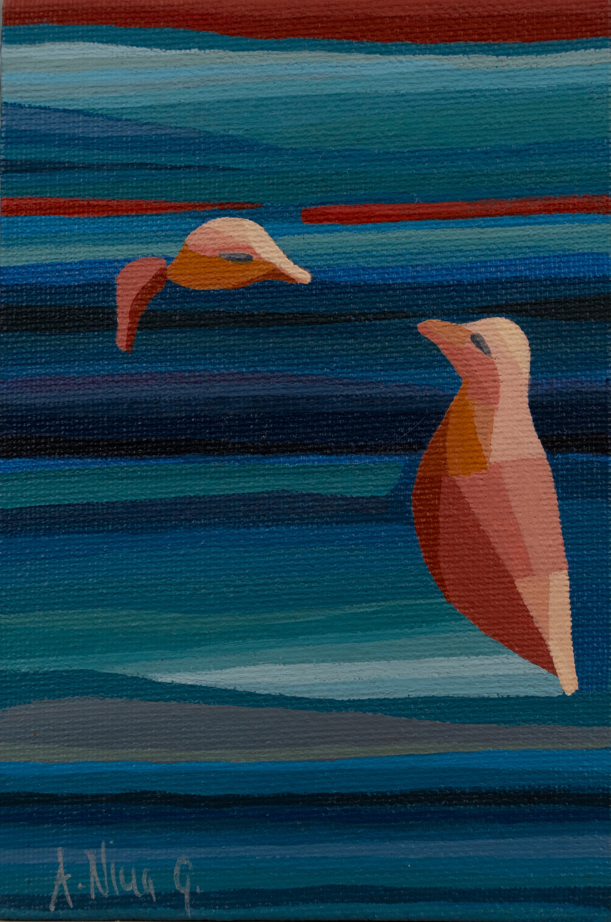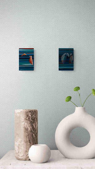 Two abstract bird-like figures engage in a silent dialogue, set against a backdrop of deep, serene blues and hints of red. The minimalist forms and harmonious color palette evoke a sense of calm and introspection.