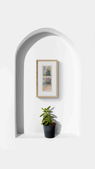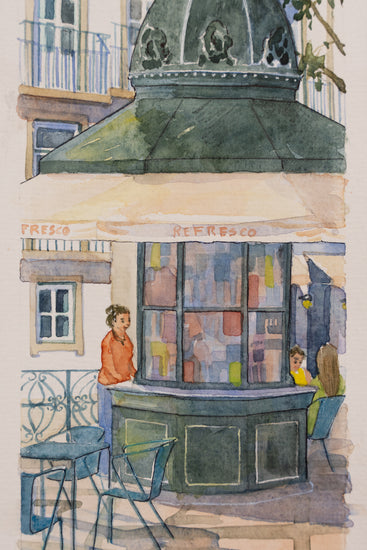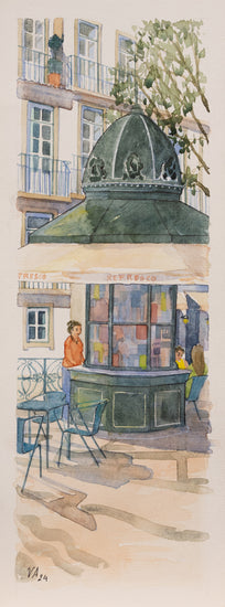 Depicting a tranquil city morning, this painting shows a tram gently moving past a quaint street café. The watercolor technique highlights the morning light and the peaceful atmosphere, inviting the viewer to imagine a slow start to the day in a bustling city.
