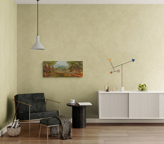 This landscape painting captures a serene forest scene bathed in warm, golden light. The pathway meanders through lush greenery, leading the viewer's eye towards the distant mountains. The soft, impressionistic brushstrokes and rich color palette create a tranquil and inviting atmosphere, evoking the peaceful beauty of nature.