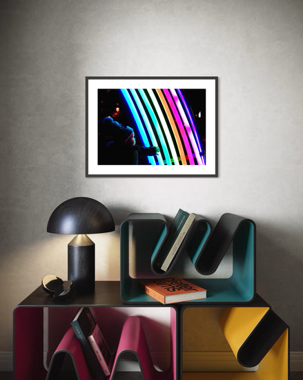 The rainbow’s bright, vibrant light contrasts sharply with the surrounding darkness, creating a magical and surreal atmosphere. The child’s curious, fascinated expression captures the essence of discovery and wonder, while the contrast between the child’s innocence and the vibrant illumination embodies a sense of awe and imagination.