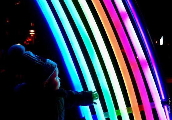 In this photograph, we see a child in profile, captivated, reaching out and touching a neon rainbow that glows intensely, serving as the gateway to the 2023 Alingsas Festival of Lights.