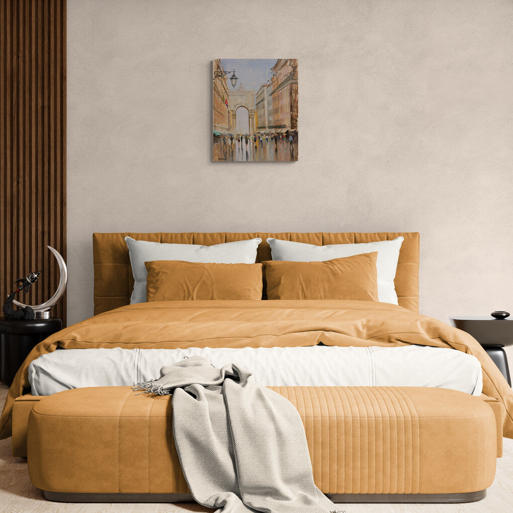 This impressionistic painting captures the charm of a city street under a gentle rain, focusing on a grand archway that stands as a centerpiece. The wet pavement reflects the muted yet vibrant colors of the surrounding buildings and the scattered pedestrians, creating a lively and atmospheric scene. The loose brushstrokes and soft, diffused light evoke a sense of tranquility and the everyday beauty found in urban life.