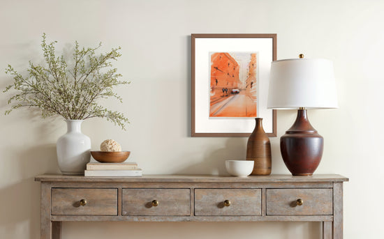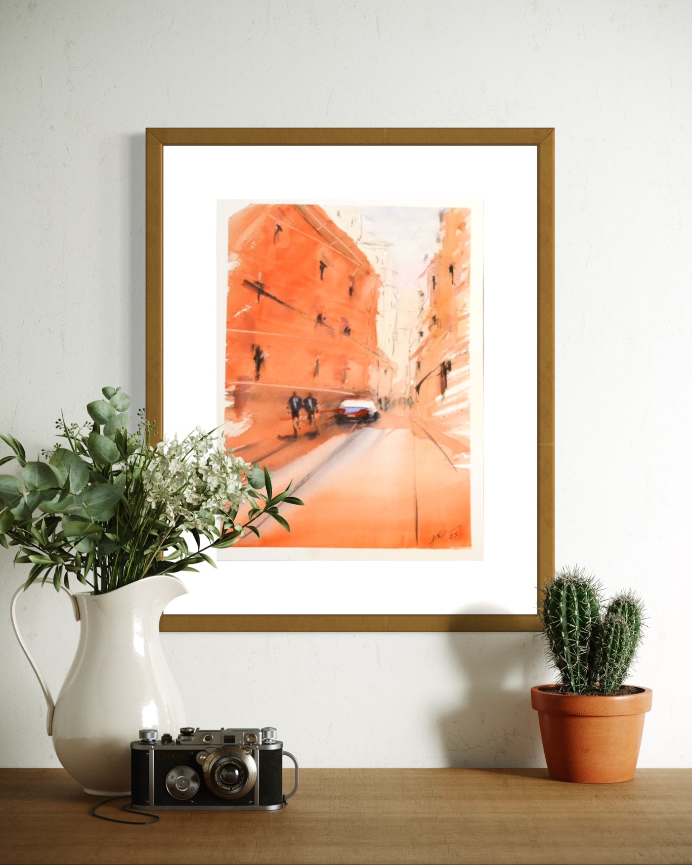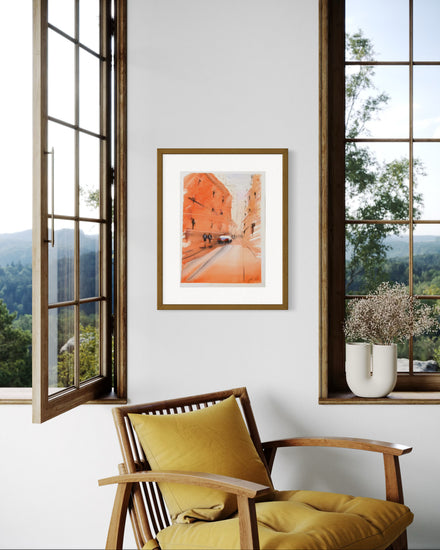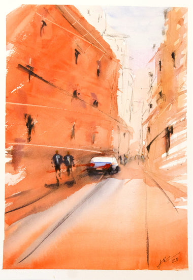A warm-toned, impressionistic street scene rendered with loose strokes and soft transitions of color, suggesting a bustling yet serene urban atmosphere.