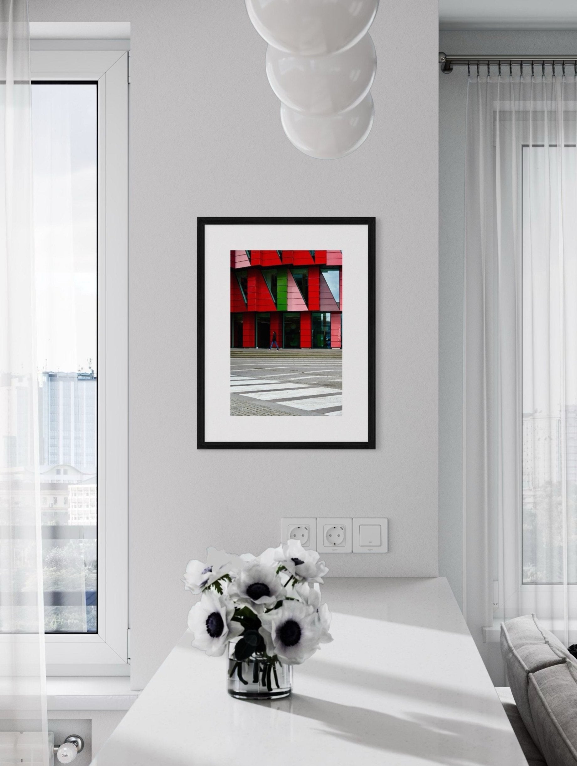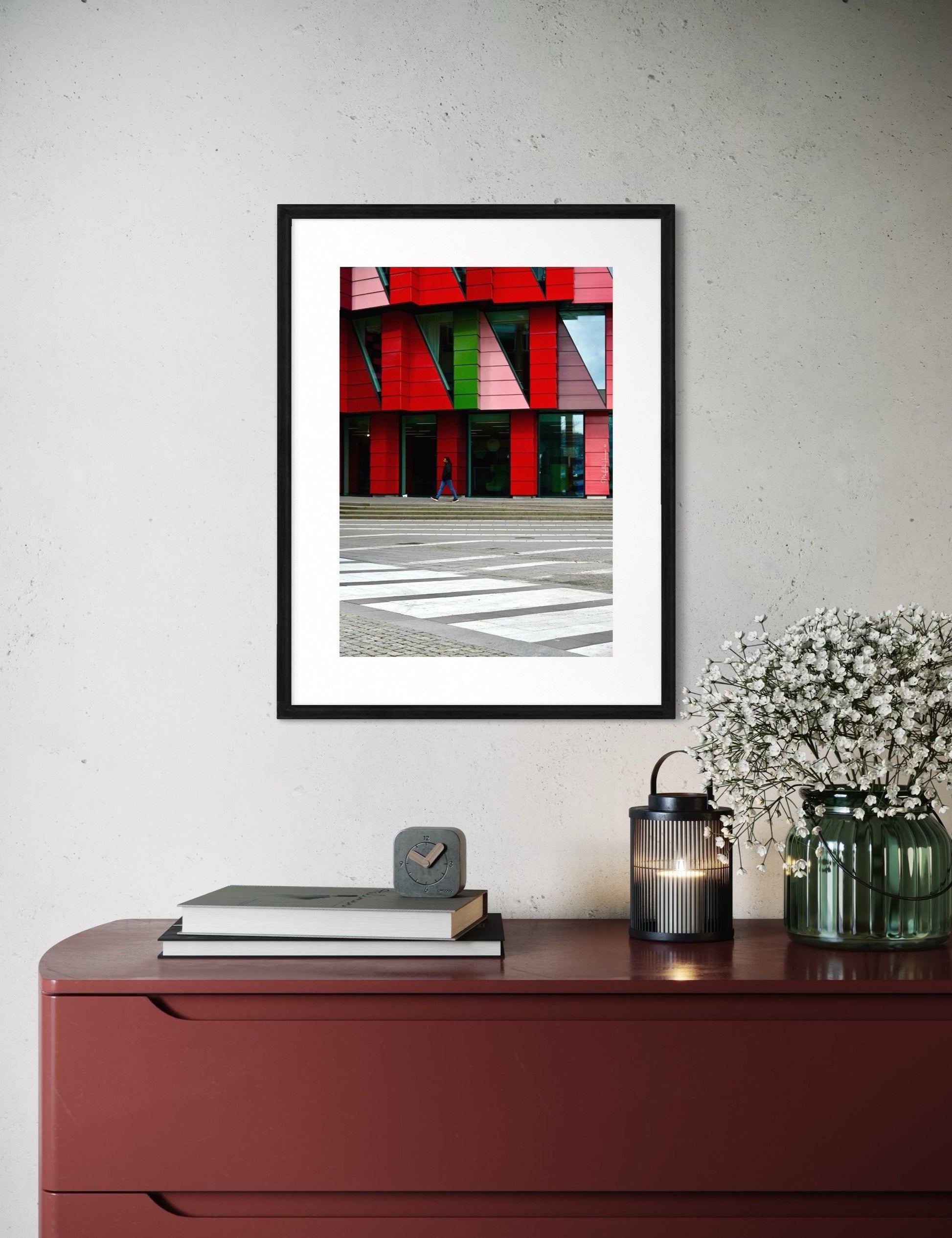 In this image, a man walks slowly in front of a striking, modern building characterized by vibrant shades of red, contrasting with the calmness that envelops the scene. The building, round and with bold architecture, stands imposingly near the riverbank, reflecting the innovative spirit of Gothenburg, a city known for its harmonious blend of tradition and modernity.