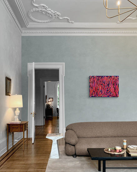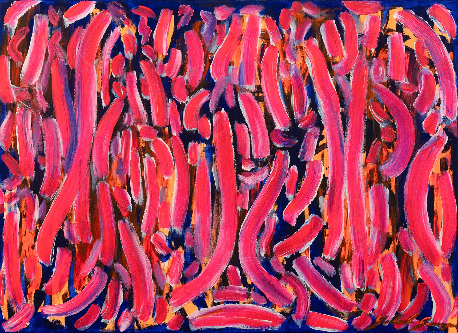 An energetic, abstract composition dominated by bold red brushstrokes against a dark background. The dynamic patterns and intense color palette evoke a sense of movement and passion.
