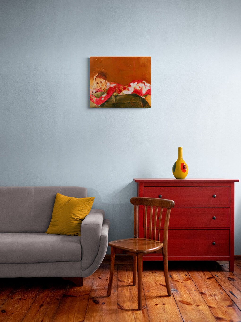 A serene, contemplative portrait of a woman reclining in a relaxed pose. The warm, earthy tones and soft brushstrokes convey a sense of calm and introspection.