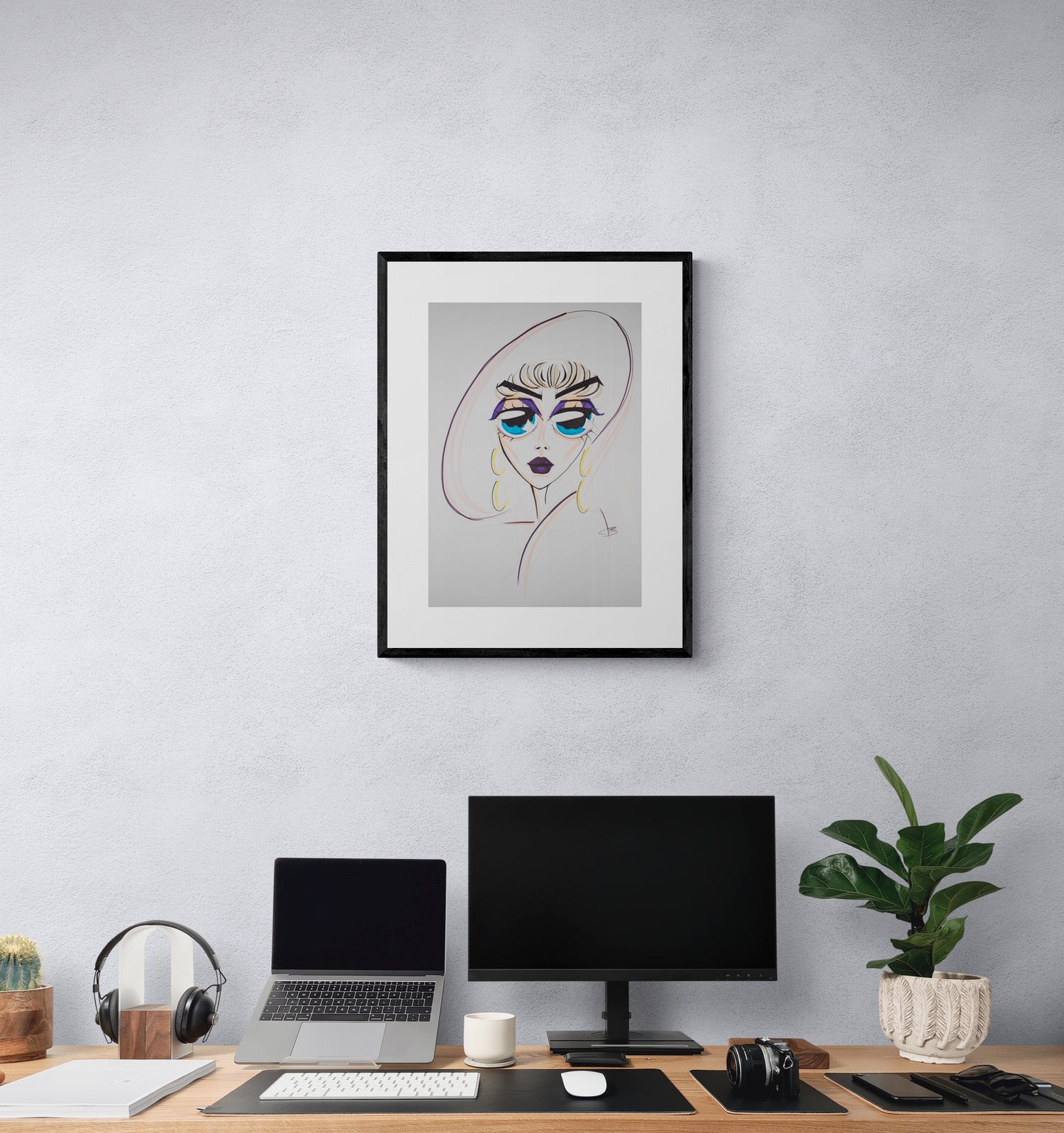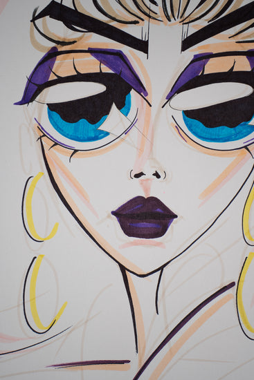 This painting showcases a stylized female face with a retro-futuristic hairstyle and dramatic, oversized blue eyeshadow.
