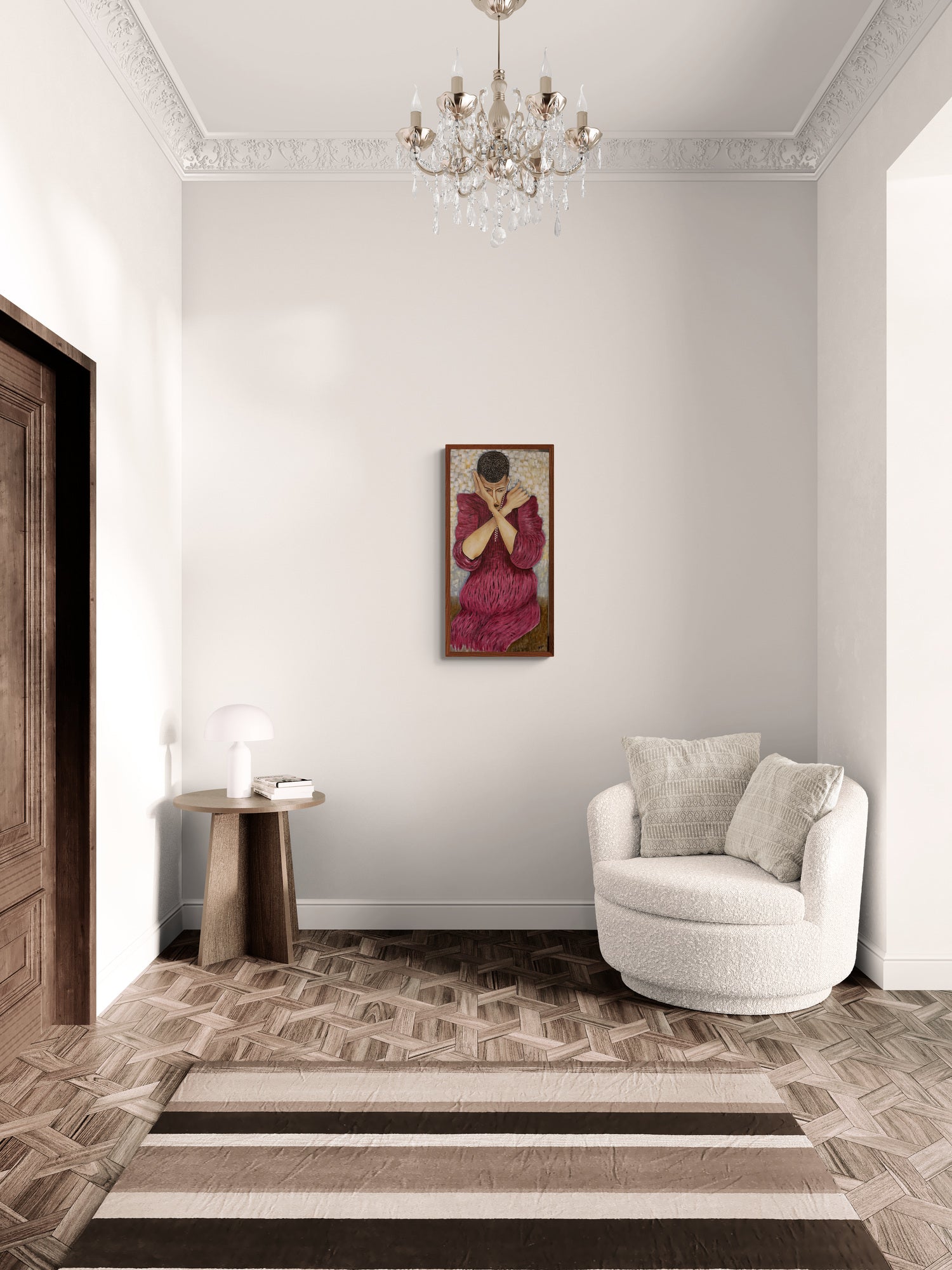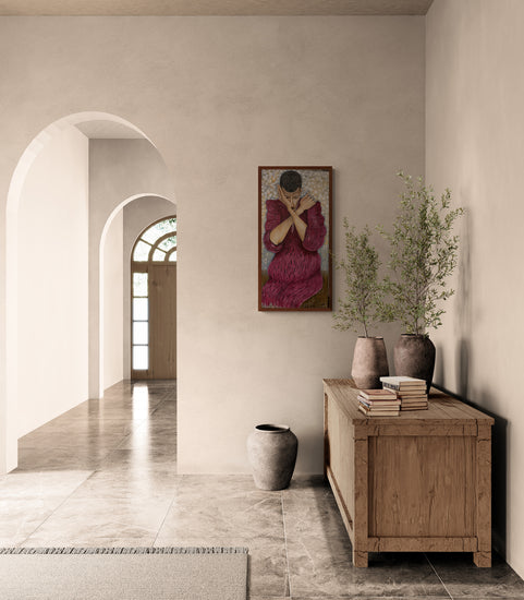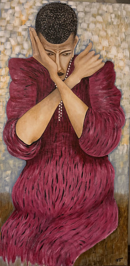 This expressive painting pays homage to the distinctive style of Egon Schiele, capturing a figure in a striking pose with arms crossed and an intense gaze. The subject's deep red garment, textured with dynamic lines, contrasts against a muted, textured background.