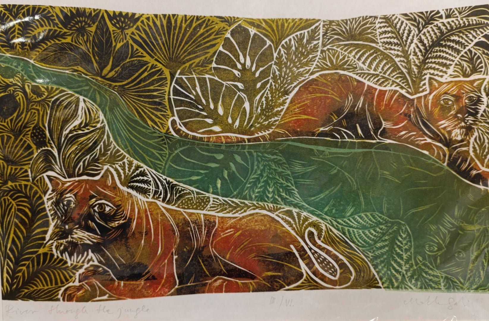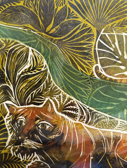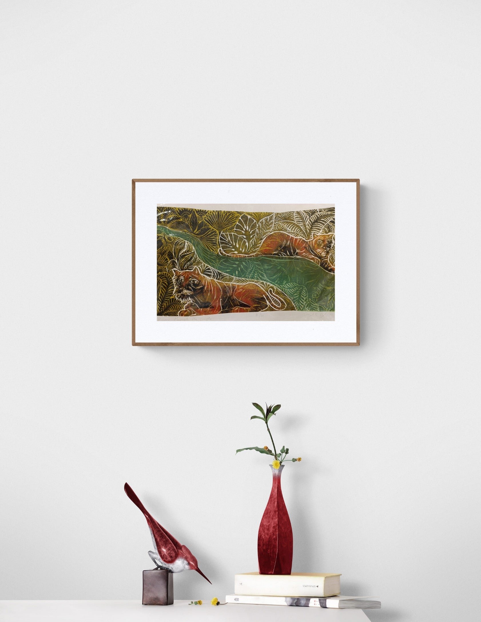 This vivid and intricate original linocut print combines rich, earthy tones with striking linework to depict two tigers lounging beside a flowing river in a dense jungle. The composition is alive with detail, from the lush, overlapping leaves to the swirling currents of the river that cut through the scene. The tigers are rendered with expressive, bold lines, embodying both the grace and raw power of the jungle. The artwork evokes a sense of wildness and mystery, inviting the viewer into this untamed world.