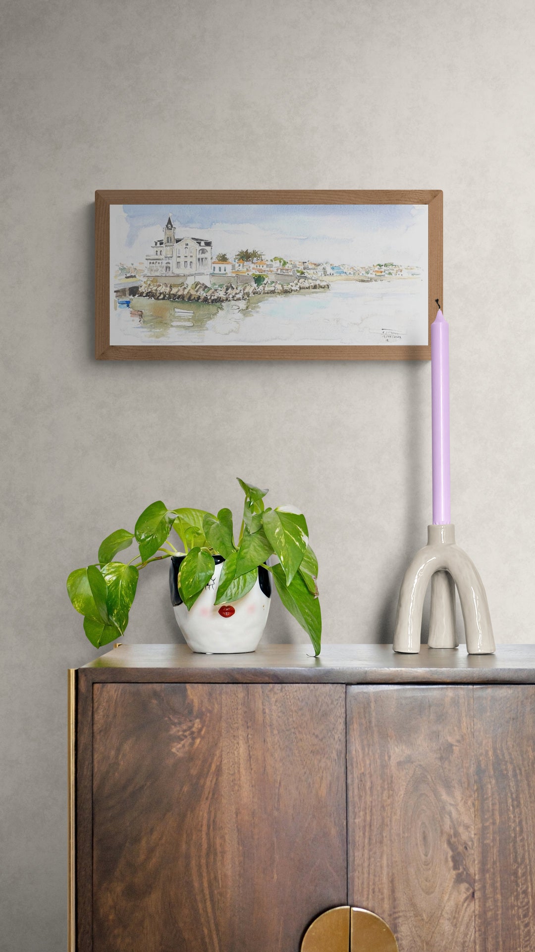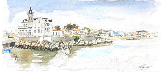 This watercolor painting showcases a charming riverside church, surrounded by lush greenery and quaint village buildings. The church's spire reaches towards the sky, while the reflection of the scene in the calm river water adds a serene and peaceful quality to the artwork.