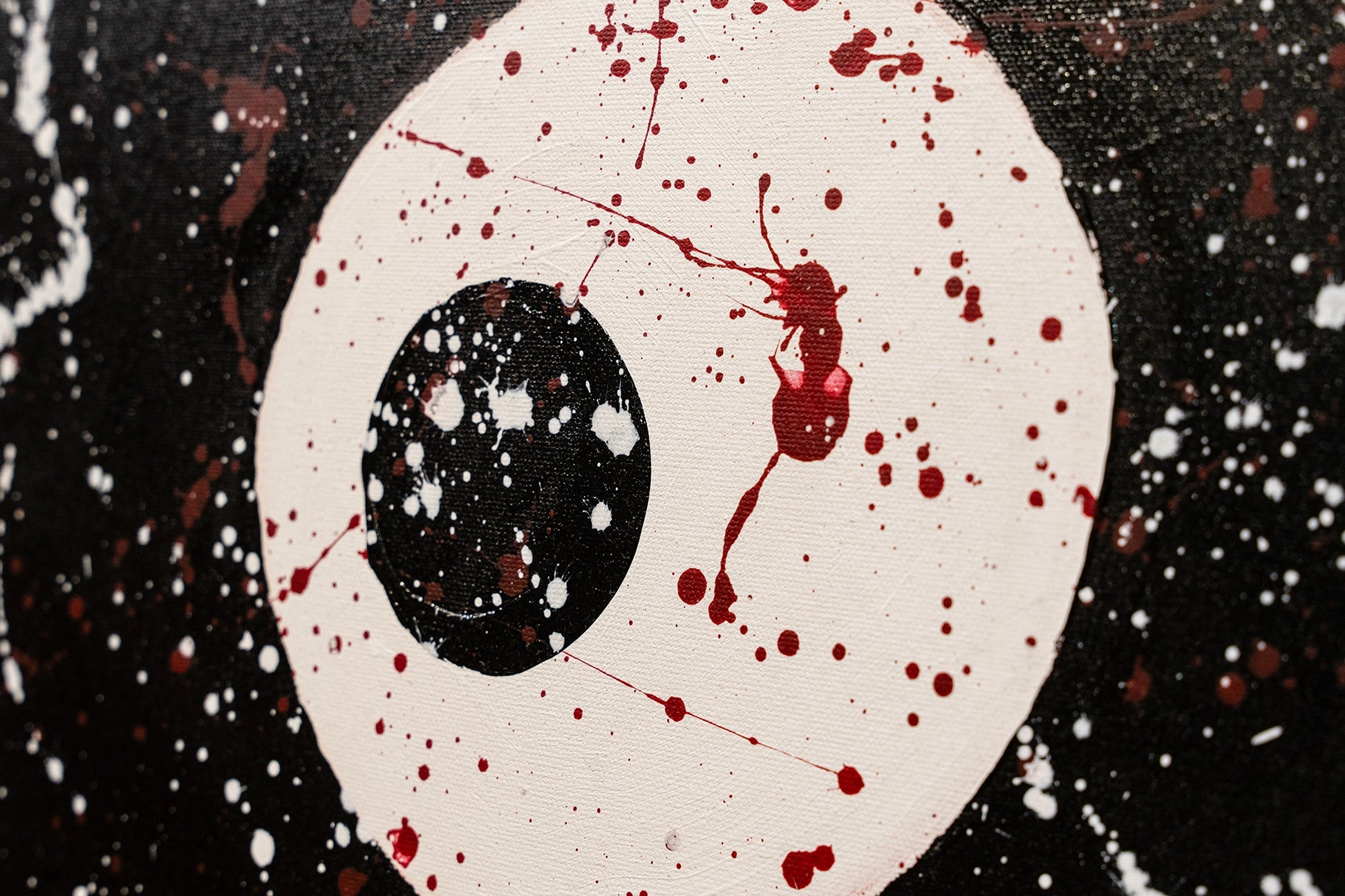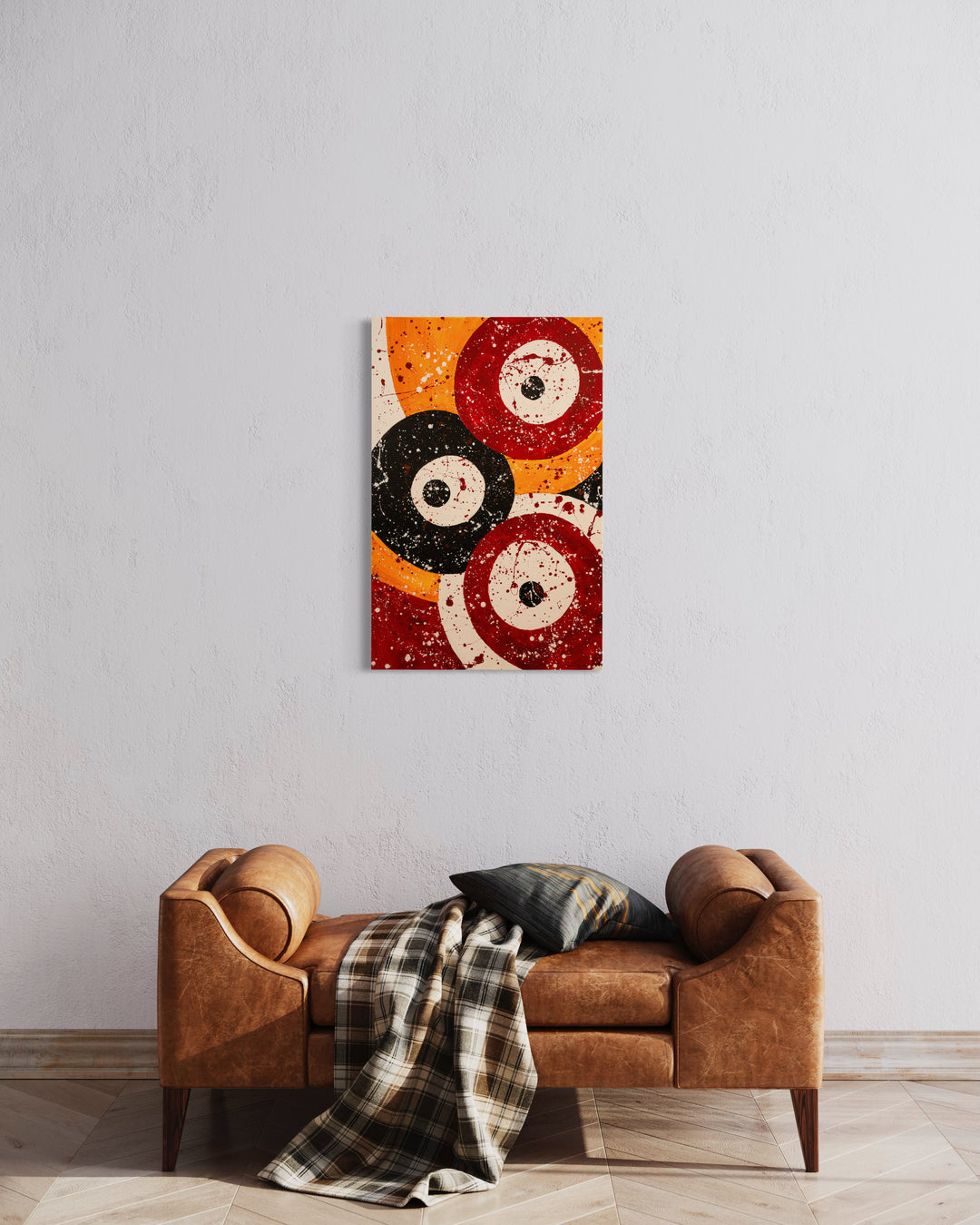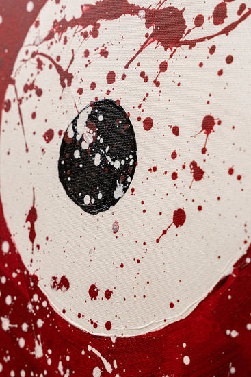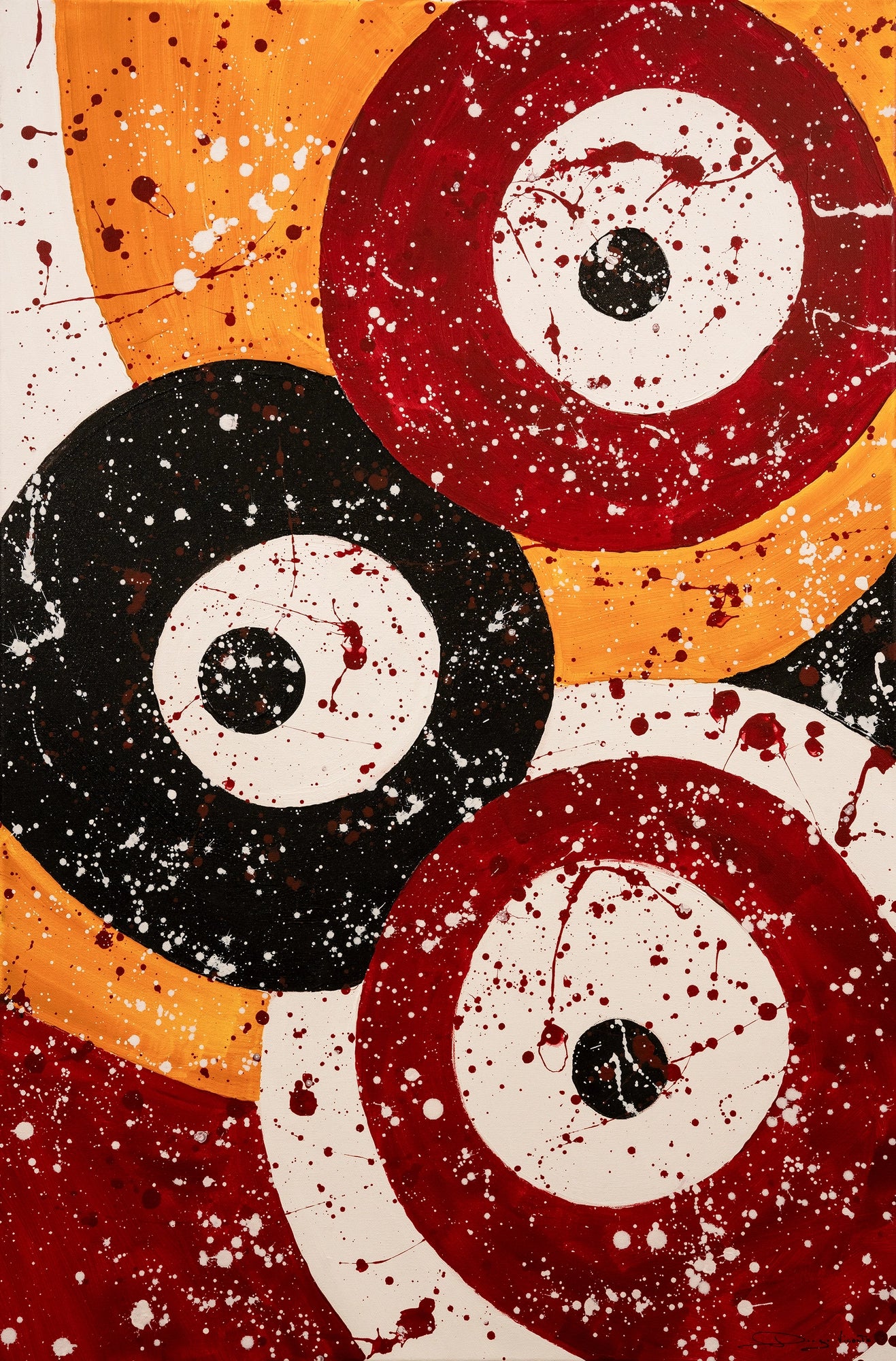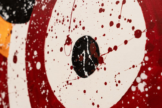 This abstract painting features bold concentric circles in black, red, and yellow against a white background, overlaid with dynamic splatters of paint. The stark contrasts and the energetic splashes give the composition a sense of movement and vitality.