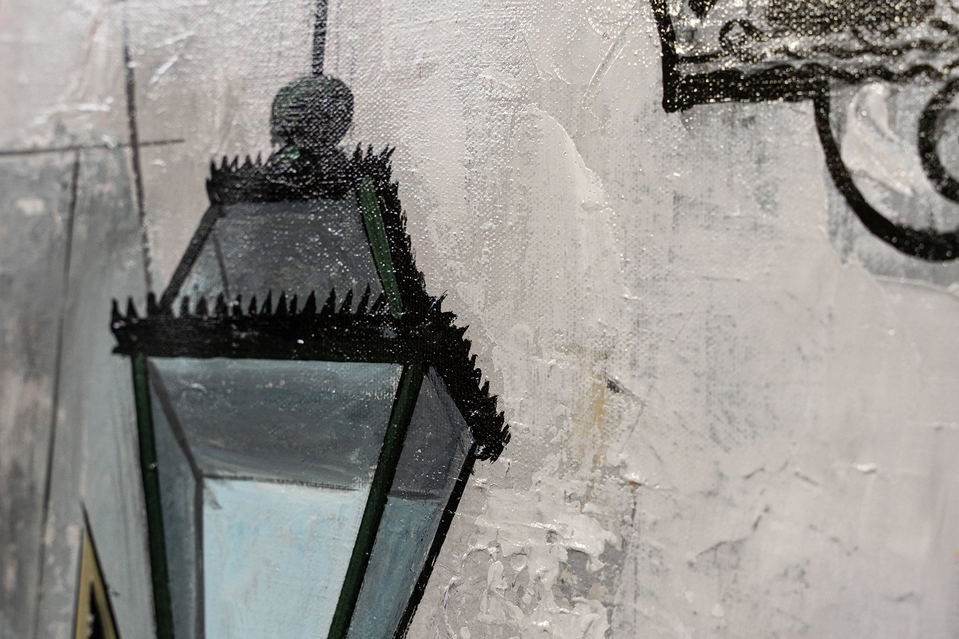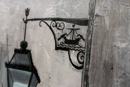 The composition centers around a classic lantern against the textured backdrop of Lisbon's renowned Rua Augusta.